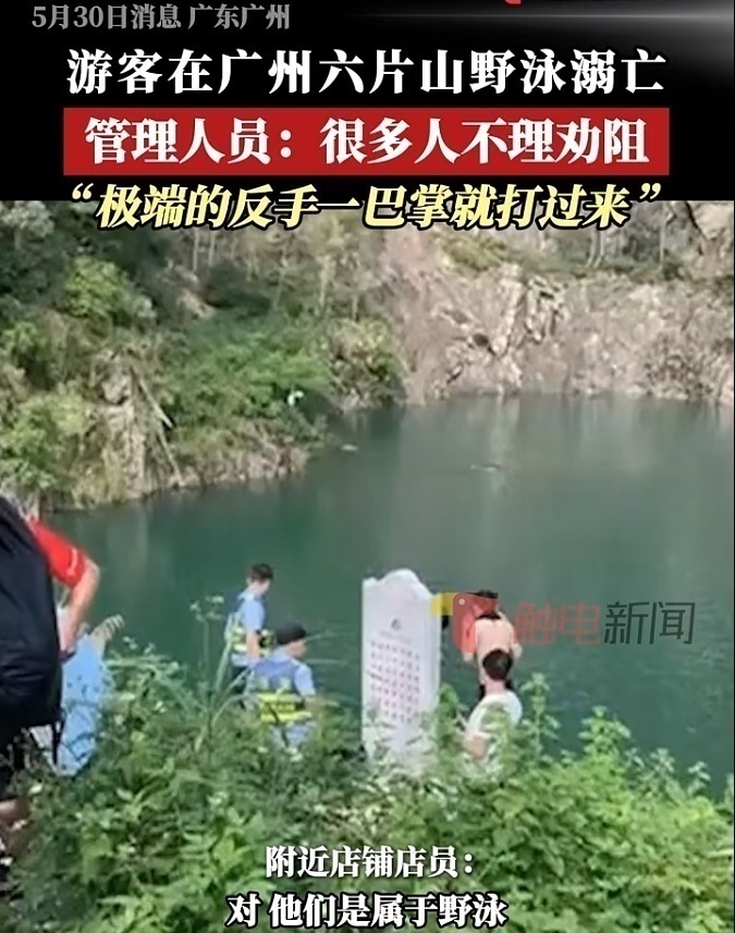 据广东台报道,5月30日,六片山“网红天池”有游客野泳不幸溺亡。景区现场有悬挂多块警示牌,但还是会有人下湖游泳。