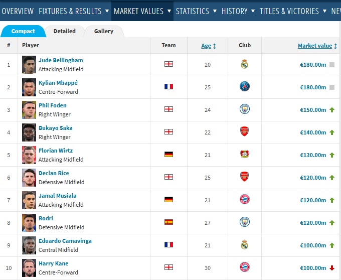 姆巴佩和贝林厄姆之后,是英格兰队的福登,这名曼城前锋的身价达到1.5亿欧元。除福登与贝林厄姆外,身价前十球员中的萨卡(1.4亿欧元,第四名)、赖斯(1.2亿欧元,第六名)、凯恩(1亿欧元,第十名)也来自英格兰队,“三狮军团”占据身价前十榜单“半壁江山”,毫无悬念地成为本届赛事的“最贵球队”。