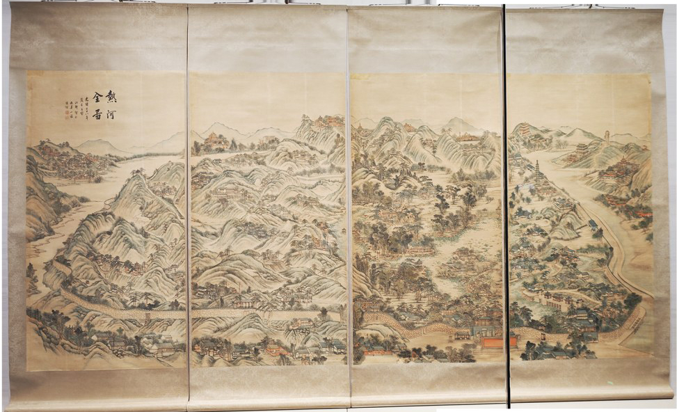 逐渐地,京畿其他城市的兴起源于北京的政治、经济、文化需要。展览中,《清代运河全图》《热河全图》四条屏、《天津行宫图》等一幅幅舆图,图解了京畿地区特有的城市关系与城市功能。其中,为了配合展示热河行宫的全景,策展团队还特意拿出一面展墙,放大还原了河北省承德市避暑山庄的《避暑山庄全景图》。“清代帝王为了保持八旗军的军事实力,每年要到围场打猎。”张杰介绍,当时,北京至围场的路上修建了行宫,其中最重要的就是热河行宫,“清代帝王可以在行宫接见蒙古王公贵族,更有利于巩固与周边民族的关系。”全景图不仅描绘了避暑山庄、外八庙以及附近山水胜景,还在图中用红色“标签”注明了每一处景致的名称。