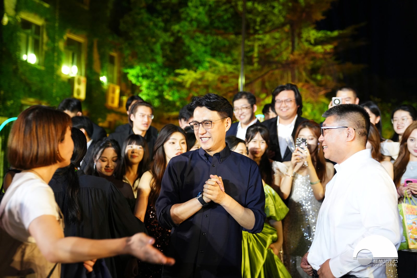 桂林艺术节组委会主任、艺委会主席、中央戏剧学院院长郝戎(右)和桂林艺术节艺委会委员、中国煤矿文工团副团长靳东(中)和大家亲切交流