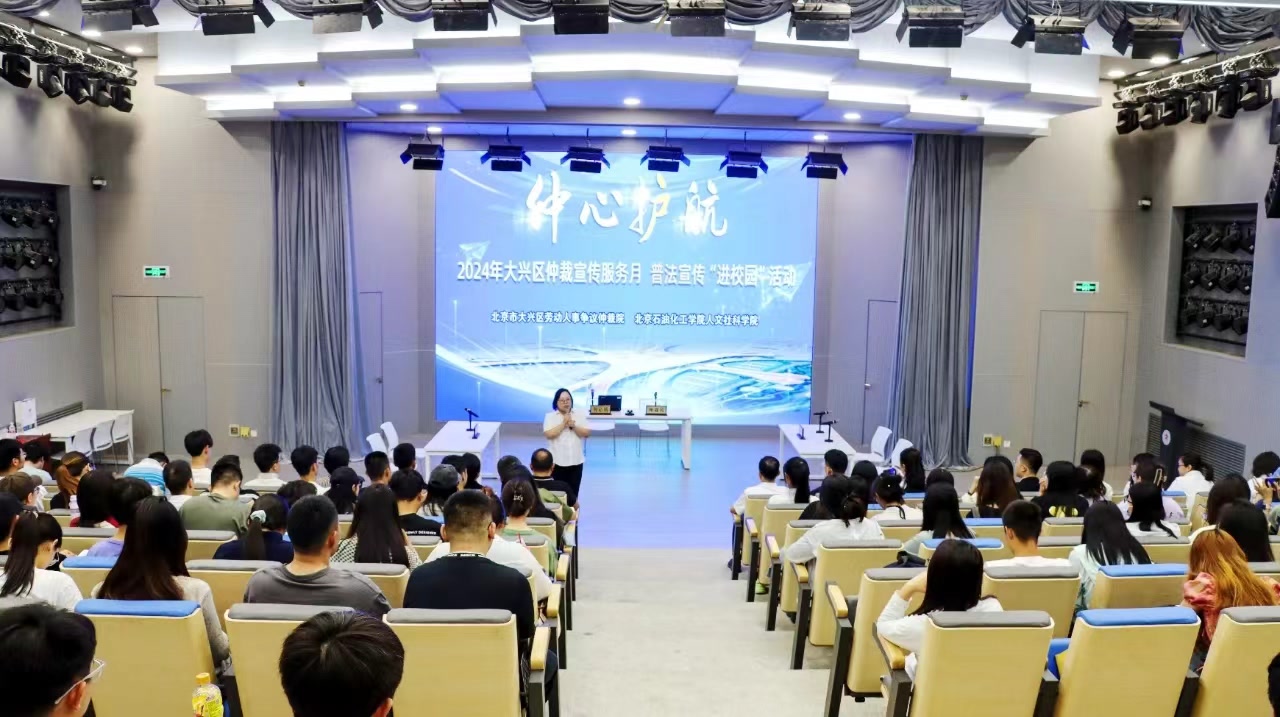 随着书记员宣读完仲裁庭纪律,大兴区仲裁院模拟仲裁庭在北京石油化工学院清源剧场正式“开庭”,审理“李小星”与“某科技有限公司”关于支付劳动报酬、违法解除劳动关系赔偿金等劳动争议一案。