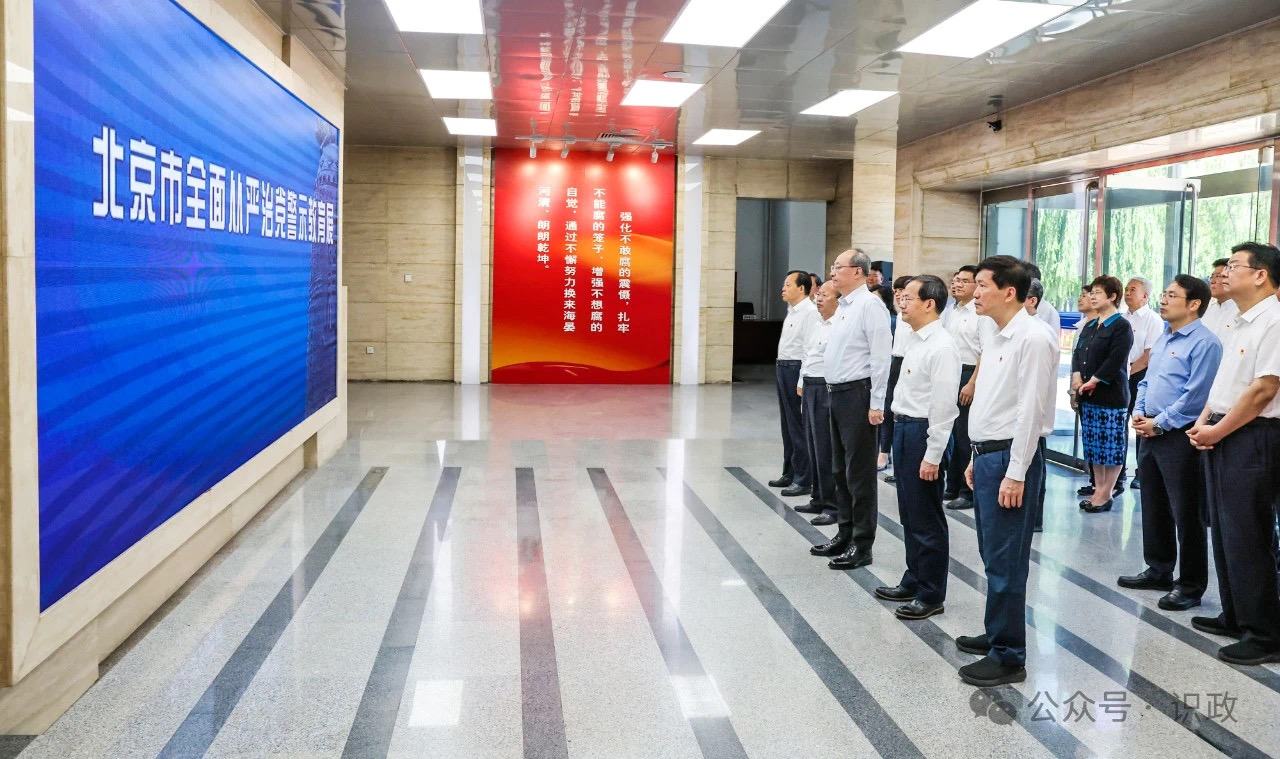 会前,市领导还来到北京市全面从严治党警示教育基地,观看警示教育宣传片,参观“挺纪在前 筑牢防线”和“以案为鉴 知畏知止”专题展。展览集中展示了北京市委坚定维护以习近平同志为核心的党中央权威和集中统一领导,坚决贯彻党的自我革命战略部署和全面从严治党战略方针,持之以恒正风肃纪反腐,通过文字、图片、视频对典型案例进行了深入剖析。市领导在一幅幅图片、一个个案例、一份份忏悔书前驻足观看、深刻感悟,用心体会全面从严治党永远在路上、党的自我革命永远在路上的深刻含义,进一步强化了学纪知纪明纪守纪,永葆清正廉洁政治本色的政治自觉、思想自觉、行动自觉。
