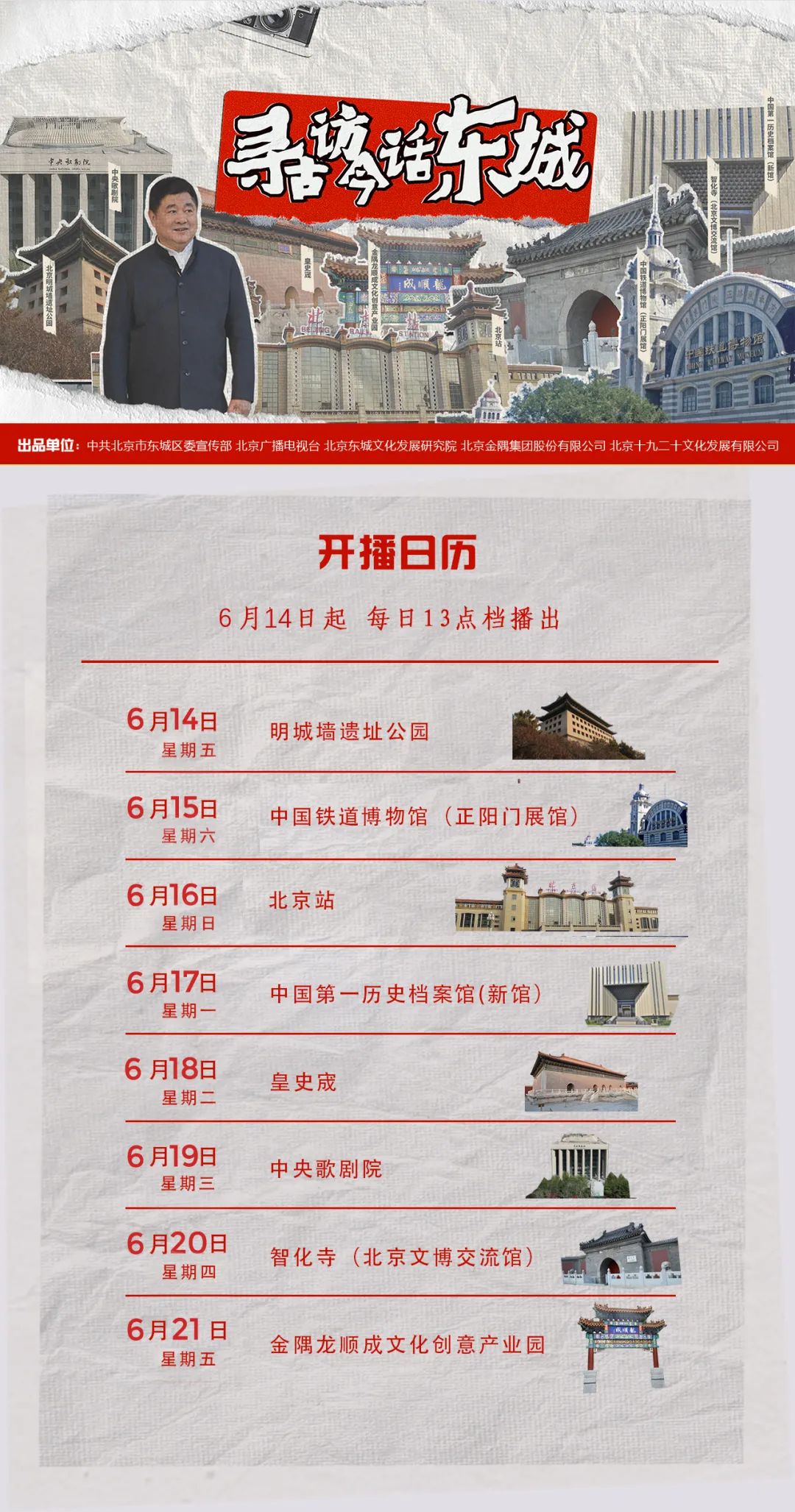 该节目由中共东城区委宣传部、北京广播电视台、北京东城文化发展研究院和北京金隅集团股份有限公司联合出品,将于6月14日—21日每日13点档,在BRTV北京卫视连续播出,“北京东城”“北京东城文化发展研究院”融媒体矩阵同步推出系列短视频。