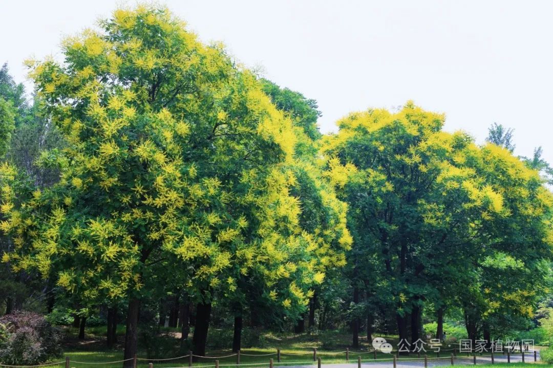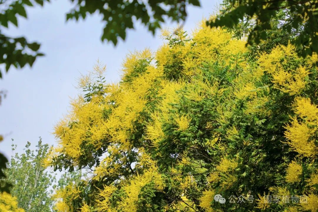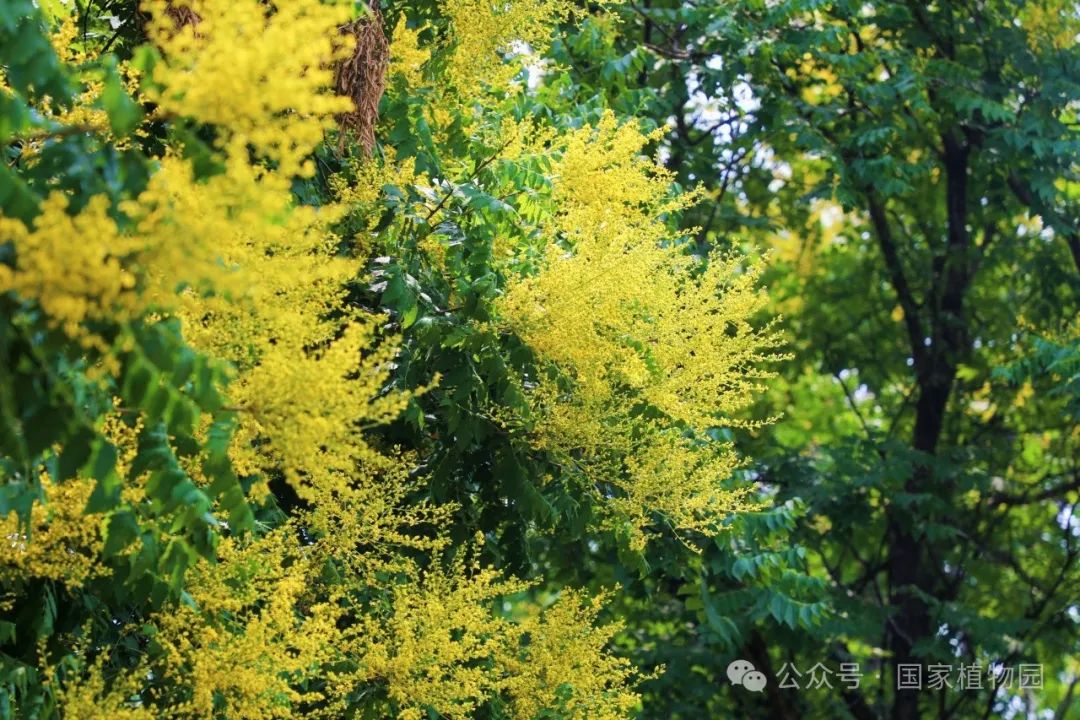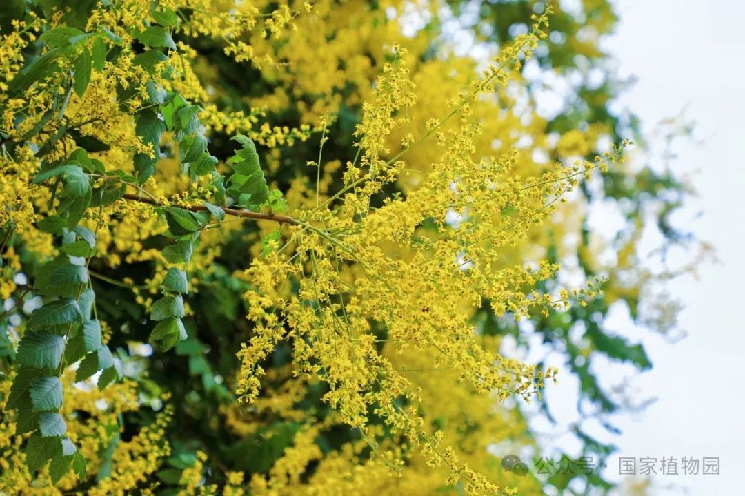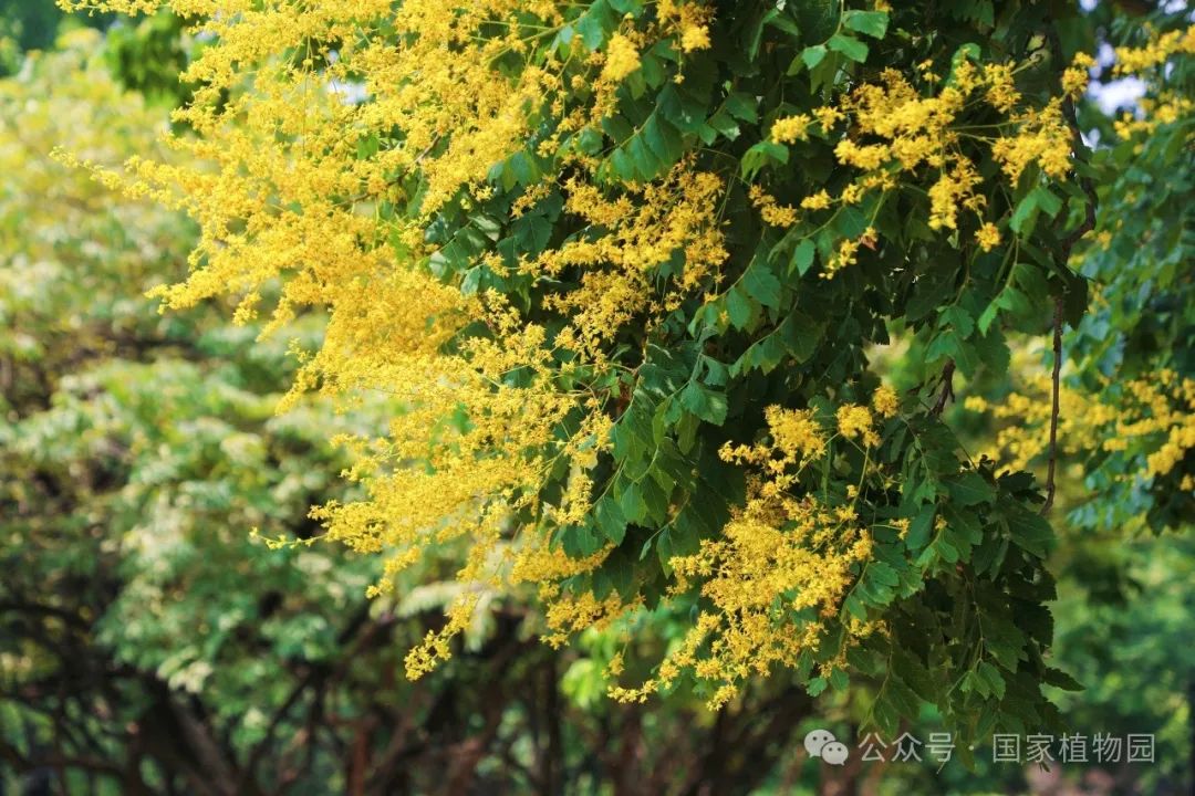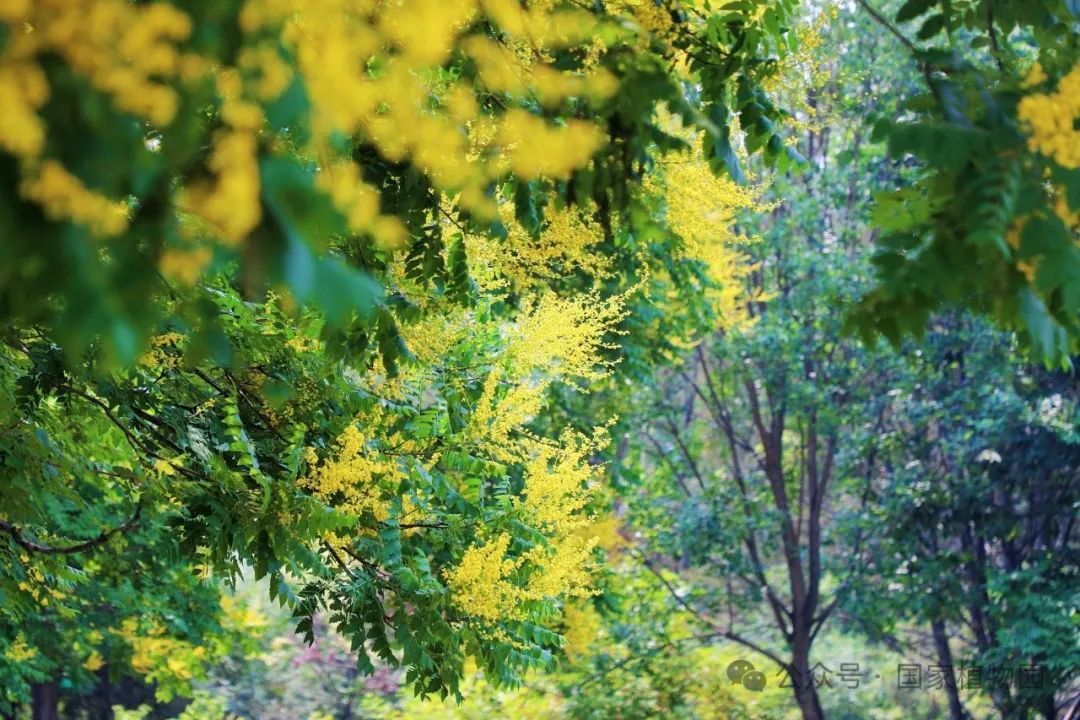 夏日的阳光倾洒而下,金黄色的花朵簇拥在枝头,密密匝匝,如同飘散在翠绿树冠上的金色云烟,点亮了整个夏日的天空。微风轻拂,树叶随风摇曳婆娑作响,金色的小花散落一地像是一场“金雨”。