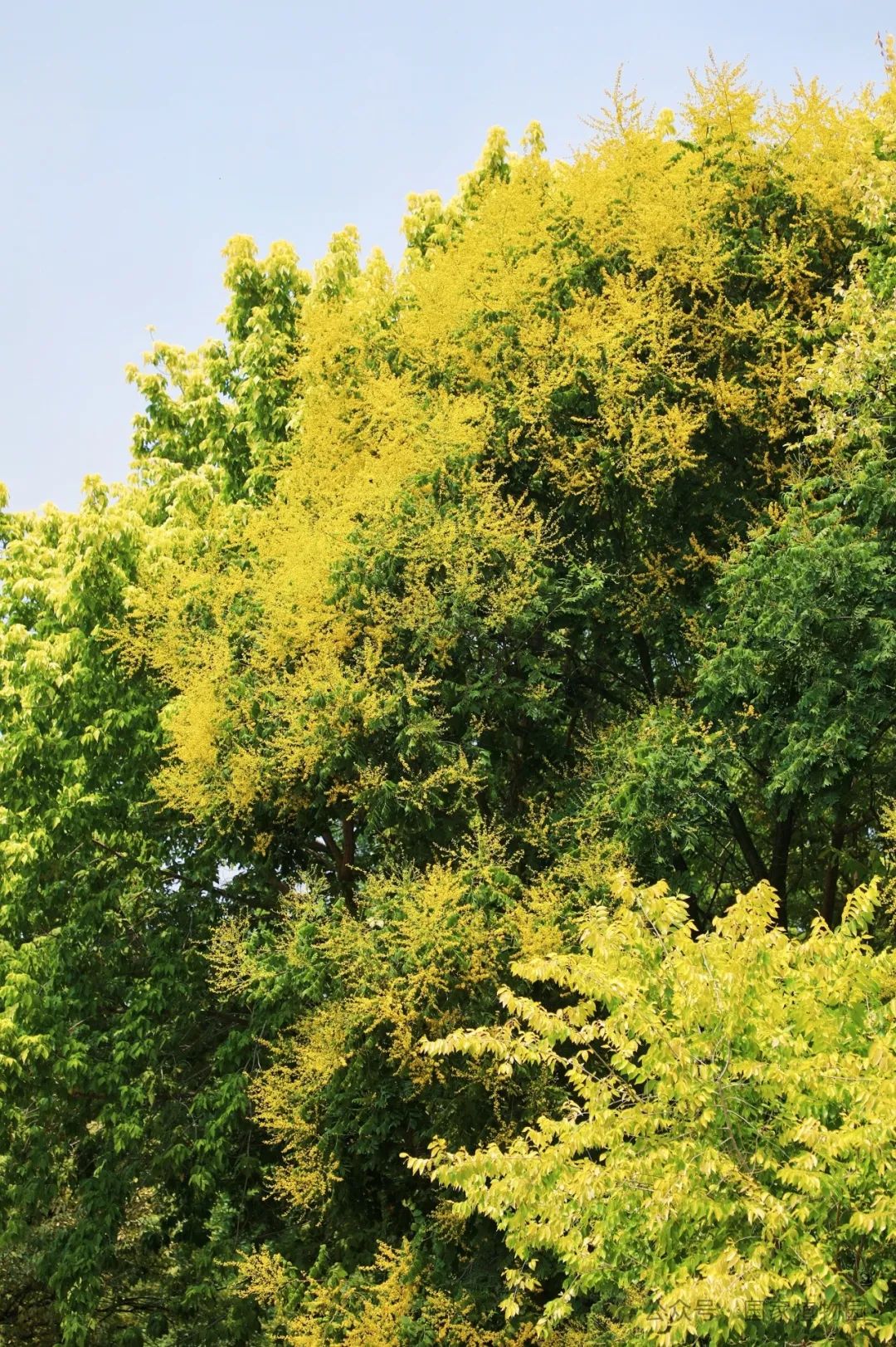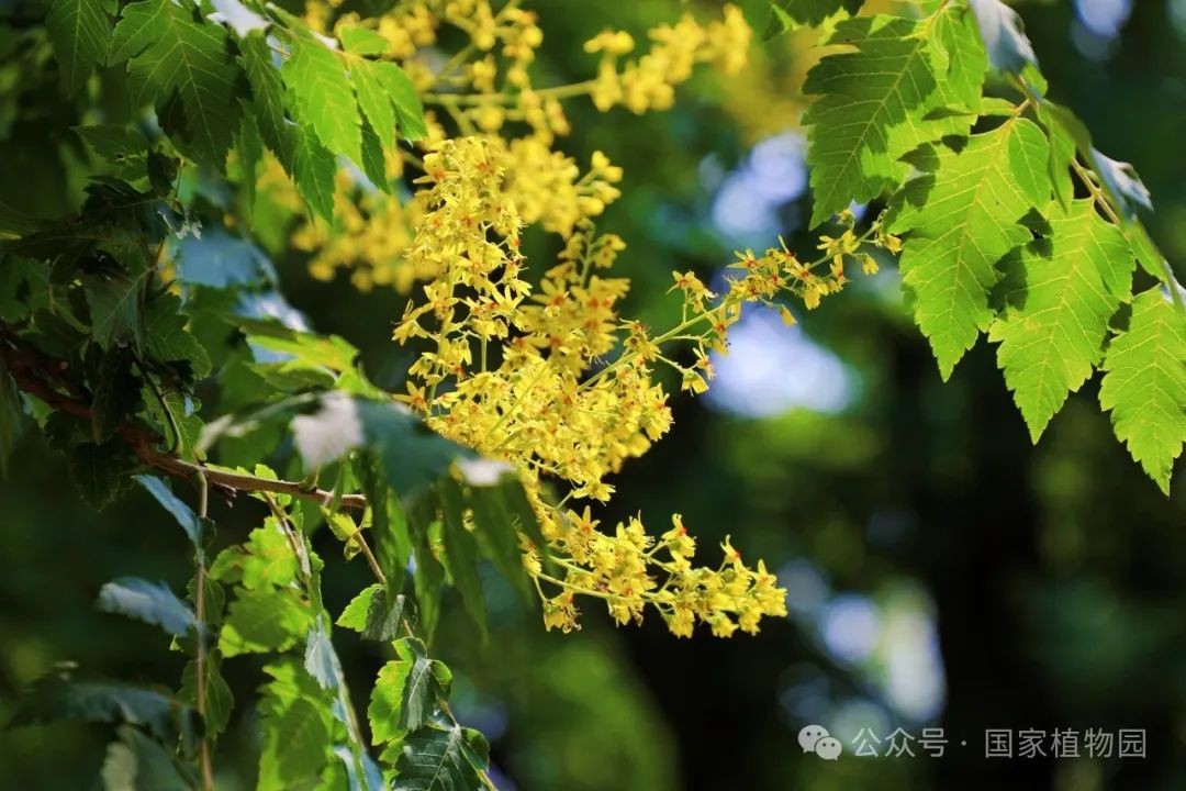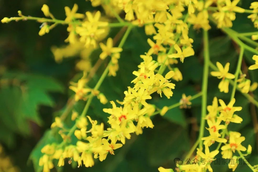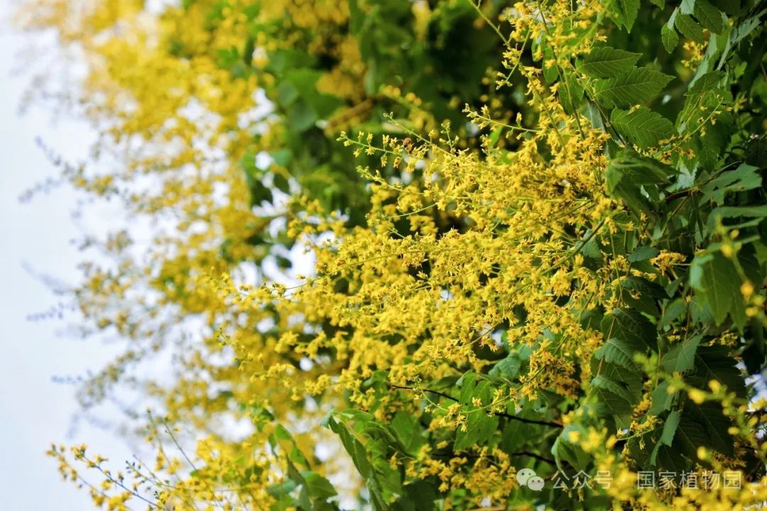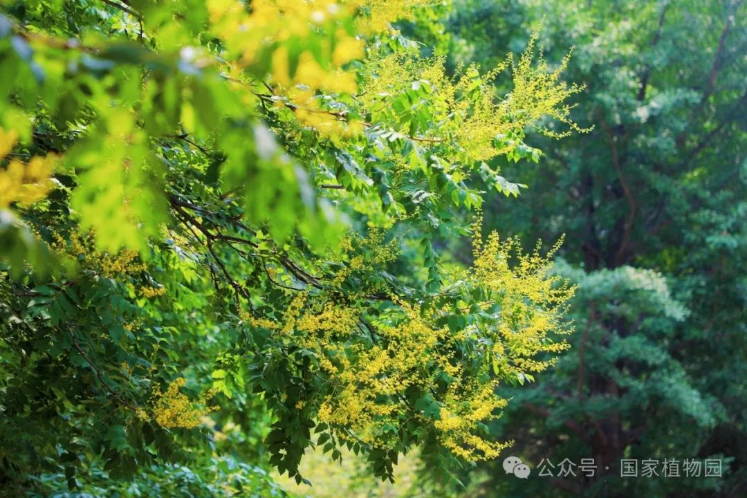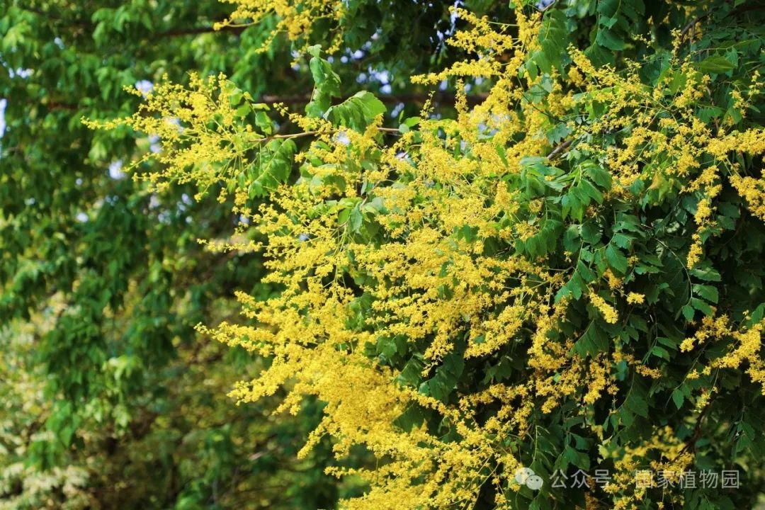 夏日的阳光倾洒而下,金黄色的花朵簇拥在枝头,密密匝匝,如同飘散在翠绿树冠上的金色云烟,点亮了整个夏日的天空。微风轻拂,树叶随风摇曳婆娑作响,金色的小花散落一地像是一场“金雨”。