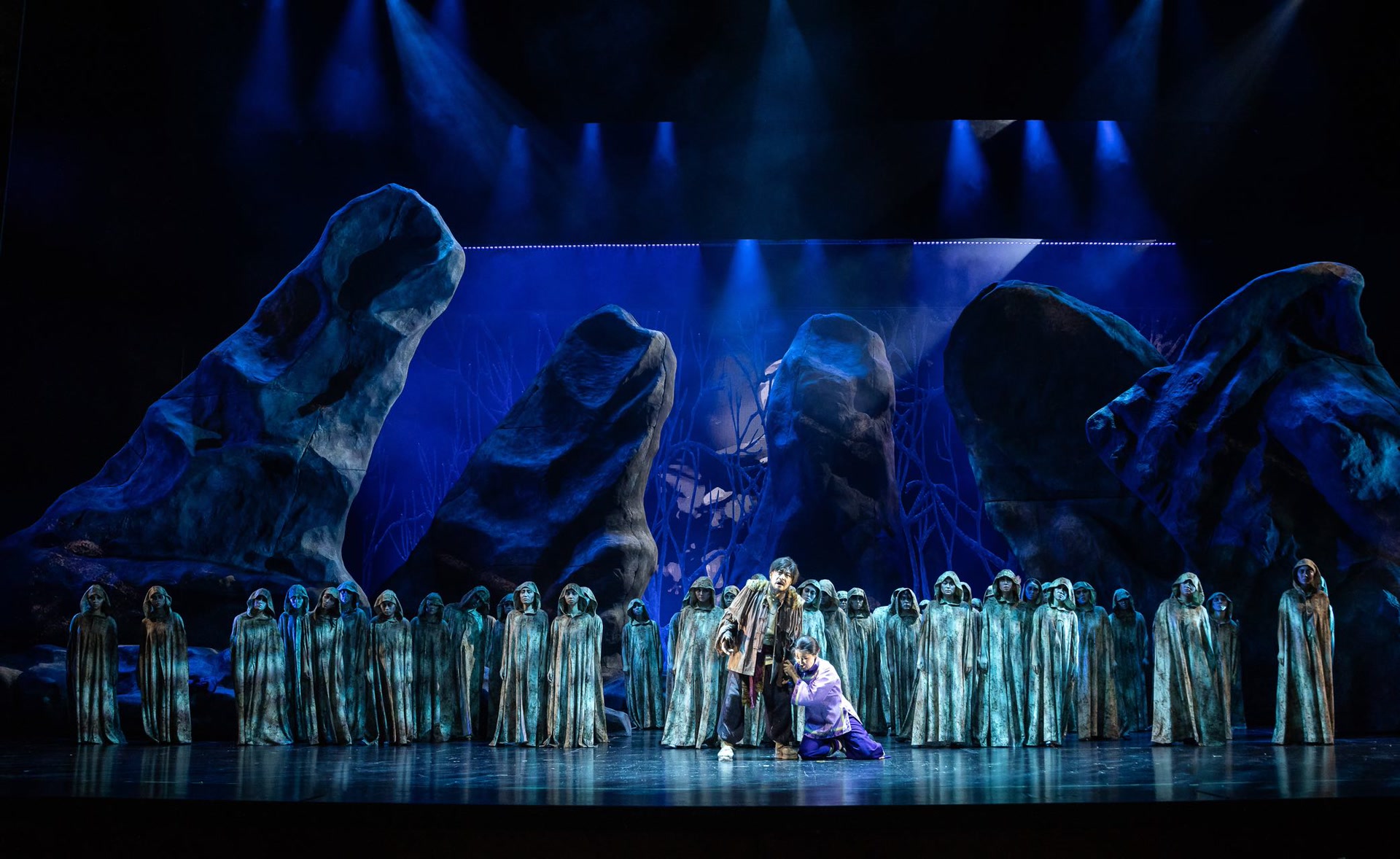 无论是《原野》的原著,还是金湘的音乐,都营造出抗争与压抑交织的氛围,此版歌剧的舞美高度配合甚至升华了这一主题。沉重的巨石矗立在舞台,还原了“原野”的意象,同时,巨石的石柱又象征命运的手掌,演员在巨大的手指间穿梭表演。巨大的手指可以移动,观众难免提心吊胆:谁也不知道这命运的手掌下一秒会张开,还是会瞬间合上,让活生生的生命化为齑粉。这极具包蕴性的瞬间,时刻调动着观众的情绪,也为音乐的立体呈现加分不少。