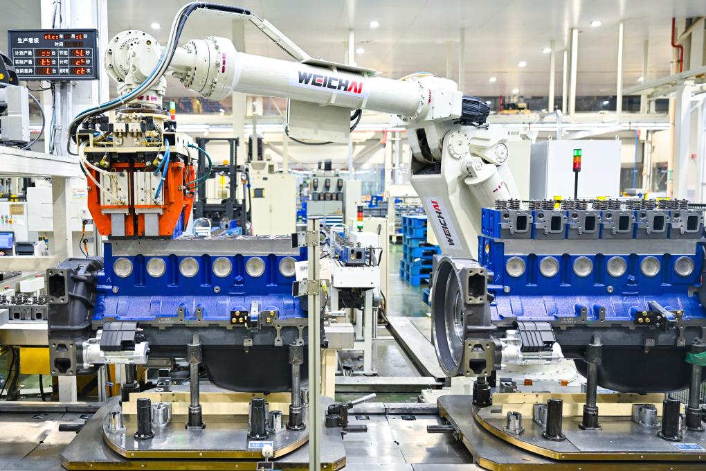 在潍柴动力股份有限公司总装生产线,机器人在装配清洁能源发动机。新华社发(孙国祥 摄)