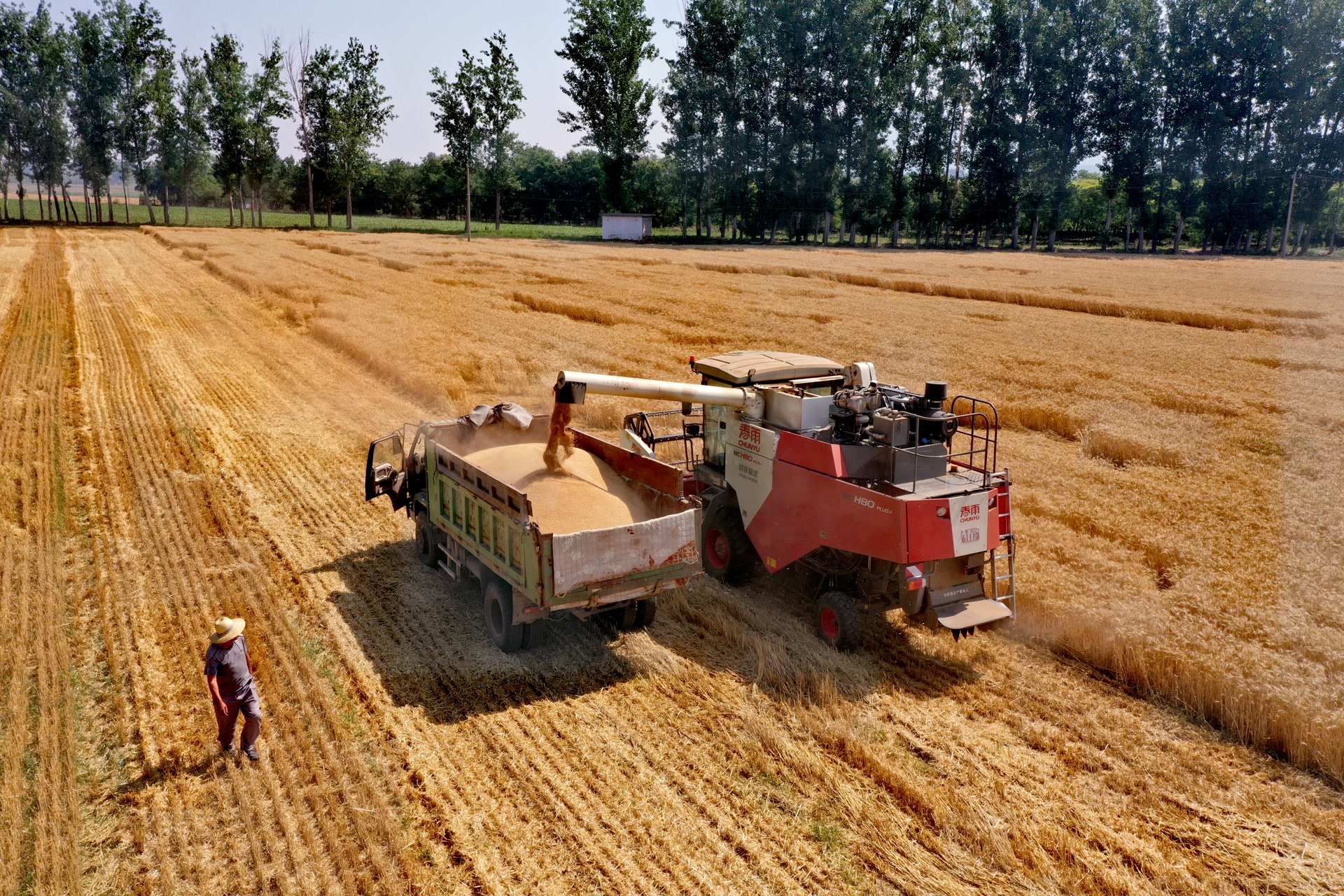 金色的麦芒随风摇曳,麦秆上挑着沉甸甸的麦穗,大型收割机在成片的田野里往来穿梭,开足马力抢收小麦,麦田中散发着阵阵麦香。 “这里以前都是碎田。一家一户分开种,靠手种手割,很辛苦,产量还提不上去。”平头村党支部书记李海忠介绍,自2015年开始,村委会将各家各户的粮田进行统一种植,由村委会负责选种、耕种、管理、收割,质量产量都有了保障,村民收成也有了提高。