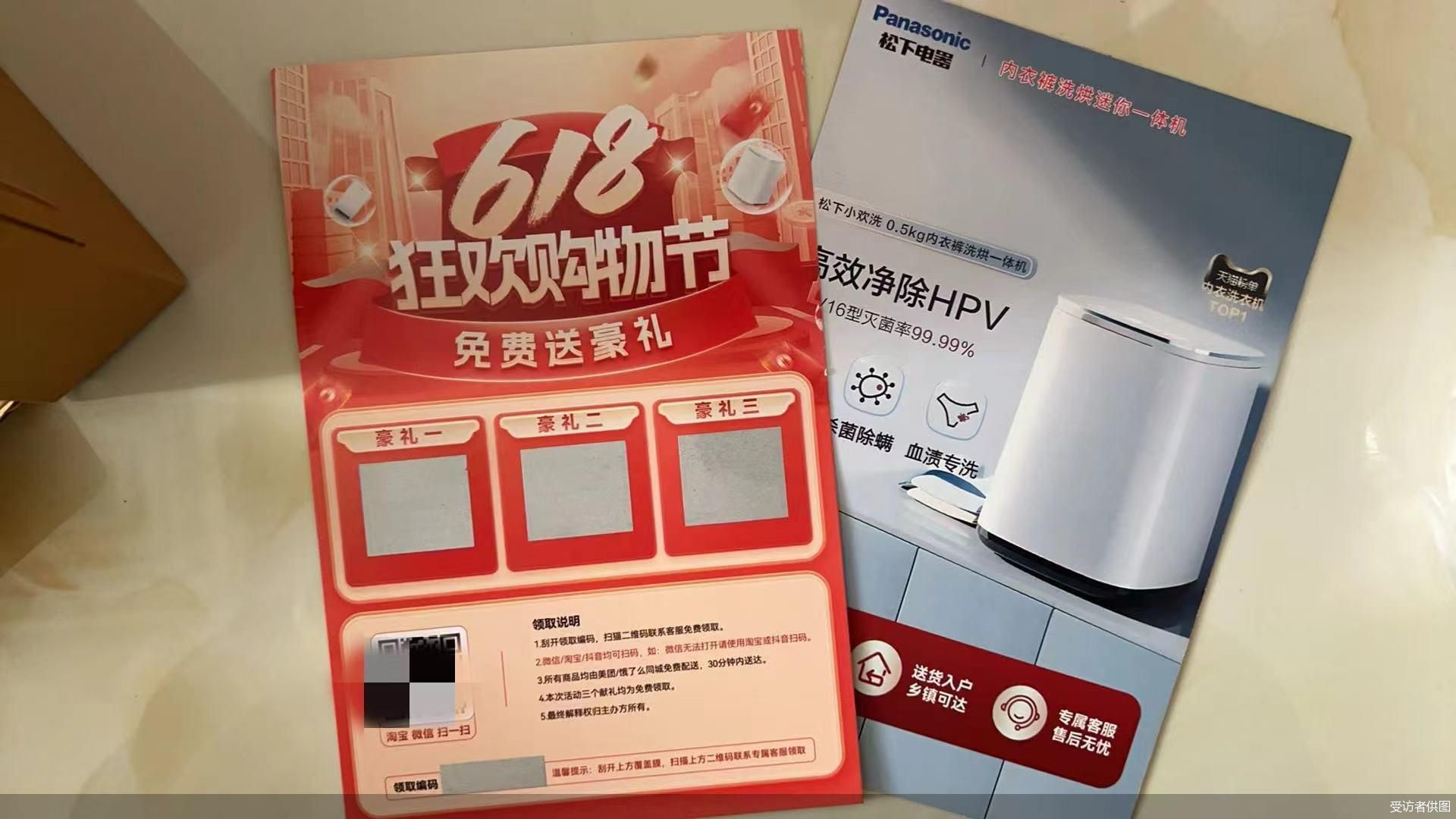 据消费者王楚楚(化名)展示的信息,她收到一件由中国邮政承运的快递,里面有数张关于“6·18”活动以及印着“松下电器”字样的宣传单。在其中一张名为“6·18狂欢购物节免费送豪礼”的宣传单上,贴有一个可微信、淘宝扫描的二维码,用户扫码后可联系客服领取奖品。