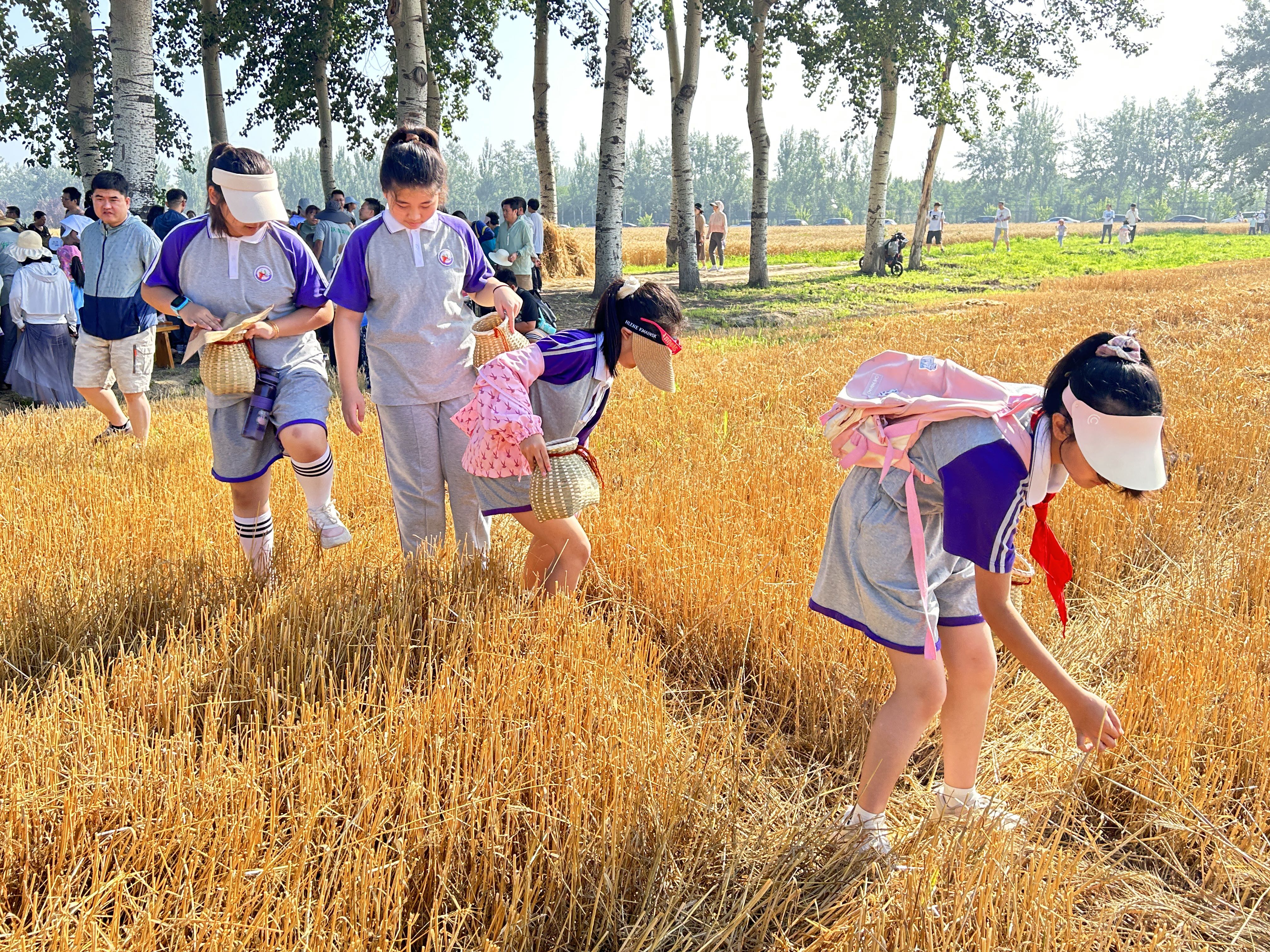 中教实验学校的学生们来到田间地头,在老师的带领下走进“丰收课堂”,绘制艺术草帽,制作麦穗花束,用石磨碾磨面粉,感受丰收的喜悦。还有的家长带着孩子,在机器收割后的麦田里捡拾麦穗,换成加工好的馒头、花卷等主食,以“颗粒归仓”表达对“谁知盘中餐,粒粒皆辛苦”的理解。