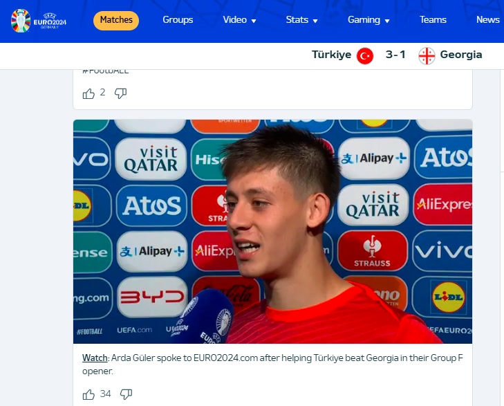 北京时间6月19日凌晨,土耳其队在2024年欧锦赛F组首轮比赛中3比1击败赛事“新军”格鲁吉亚队。比赛第65分钟,土耳其队小将居莱尔打入一脚精彩远射,从而以19岁114天的年龄打破C罗保持的欧锦赛正赛首秀破门最年轻纪录。
