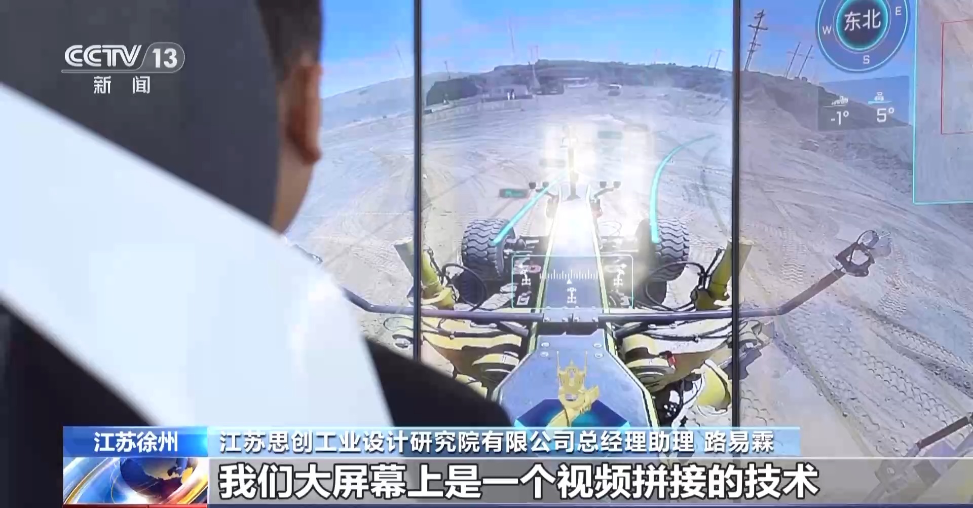 江苏思创工业设计研究院有限公司总经理助理 路易霖:我们大屏幕上是一个视频拼接的技术,还原了真实驾驶操作过程中的实际效果。我们在上面的交互功能,包括AI障碍物的智能识别,数字孪生式的铲刀姿态方案,帮助我们的操作人员能够更好、更直观来操控我们的产品。