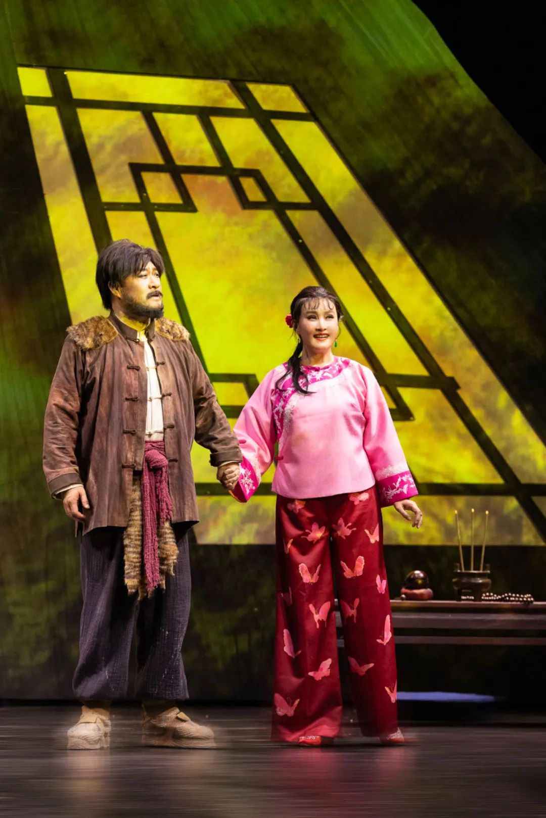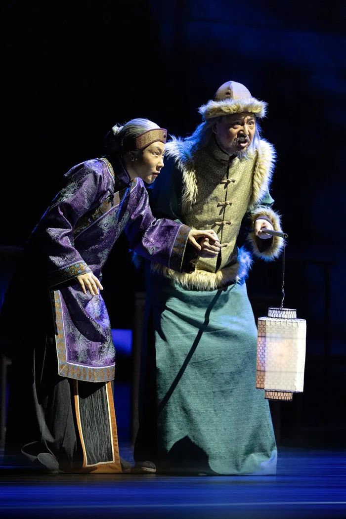 此外,尤泓斐、郝苗分别饰演的金子、焦母两个角色,也散发出了较夺目的光彩。不同的是,相比于高鹏的吐字清晰,尤泓斐在字正腔圆方面略有逊色,部分场景离开了提词器,笔者难以听清她嘴里的唱词,当然这或许与同步的乐队之突兀有一定的关联。郝苗的表演有一定的难度,因为受制于角色本身,她无法用眼睛与观众交流,但其通过较为准确的形体语言和沉浸式的歌唱,使一个狠毒且爱子心切的瞎老太太的形象跃然于舞台之上。
