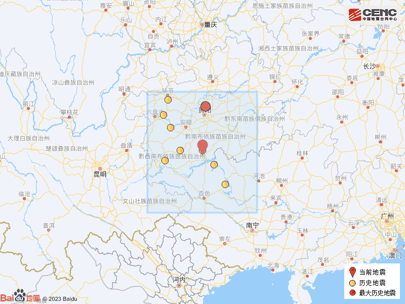 历史地震:根据中国地震台网速报目录,震中周边200公里内近5年来发生3级以上地震共10次,最大地震是2021年11月24日在贵州贵阳市修文县发生的4.6级地震(距离本次震中159公里),历史地震分布如图。