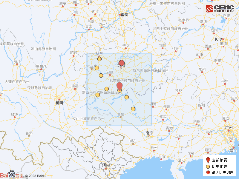 历史地震:根据中国地震台网速报目录,震中周边200公里内近5年来发生3级以上地震共12次,最大地震是2021年11月24日在贵州贵阳市修文县发生的4.6级地震(距离本次震中157公里),历史地震分布如图。