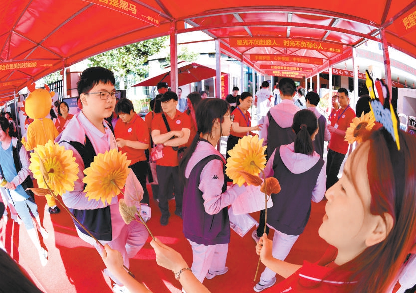 今天7时,人大附中经开学校考点外,老师和家长们身穿红色上衣,手拿向日葵等小道具,列队送考生进入考场,送上热情的鼓励。 本报记者 和冠欣 摄