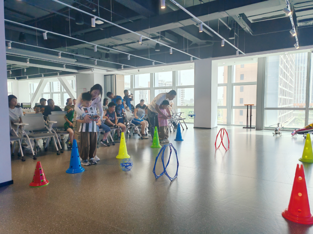小朋友们在无人机驾驶舱上的场景模拟练习后,还在教练的指导下,亲自体验了足球无人机过障碍飞行,钻圈、过锥、绕环等,模拟了室外飞行的各种突发状况,小朋友们在操作中,收获快乐,掌握无人机操作技能,这也极大地激发了孩子们探索科技的热情。此外,刘忠华老师还带来直升无人机飞行表演。