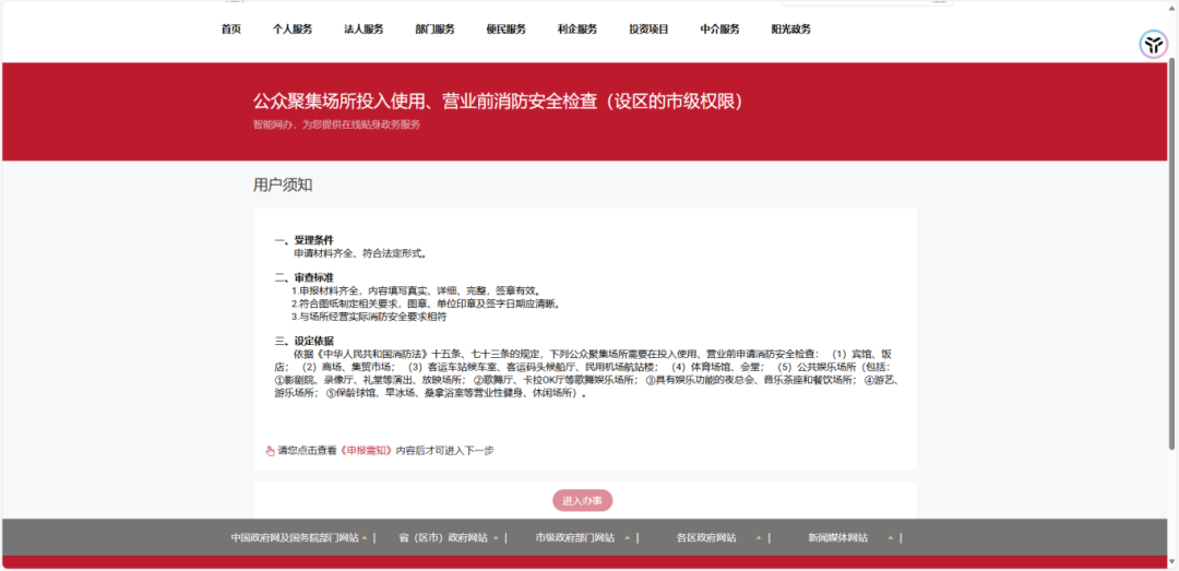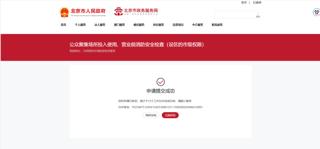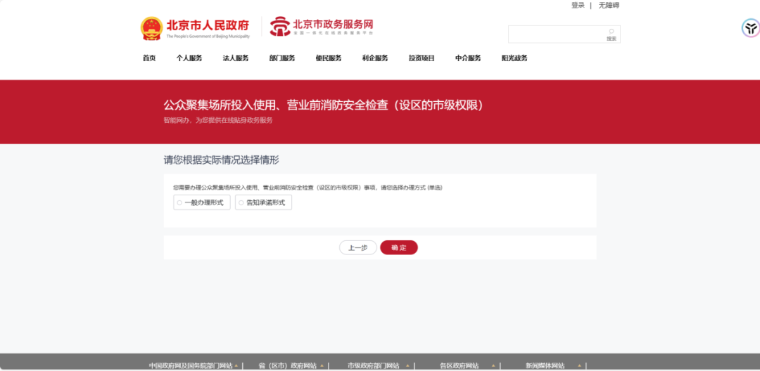 登录北京市政务服务网(https://banshi.beijing.gov.cn)或“京通”APP线上办理,搜索栏输入“公众聚集场所”或“开业前检查”→找到“公众聚集场所投入使用、营业前消防安全检查(设区的市级权限)”→选择所在区级→登录身份信息→立即办理。