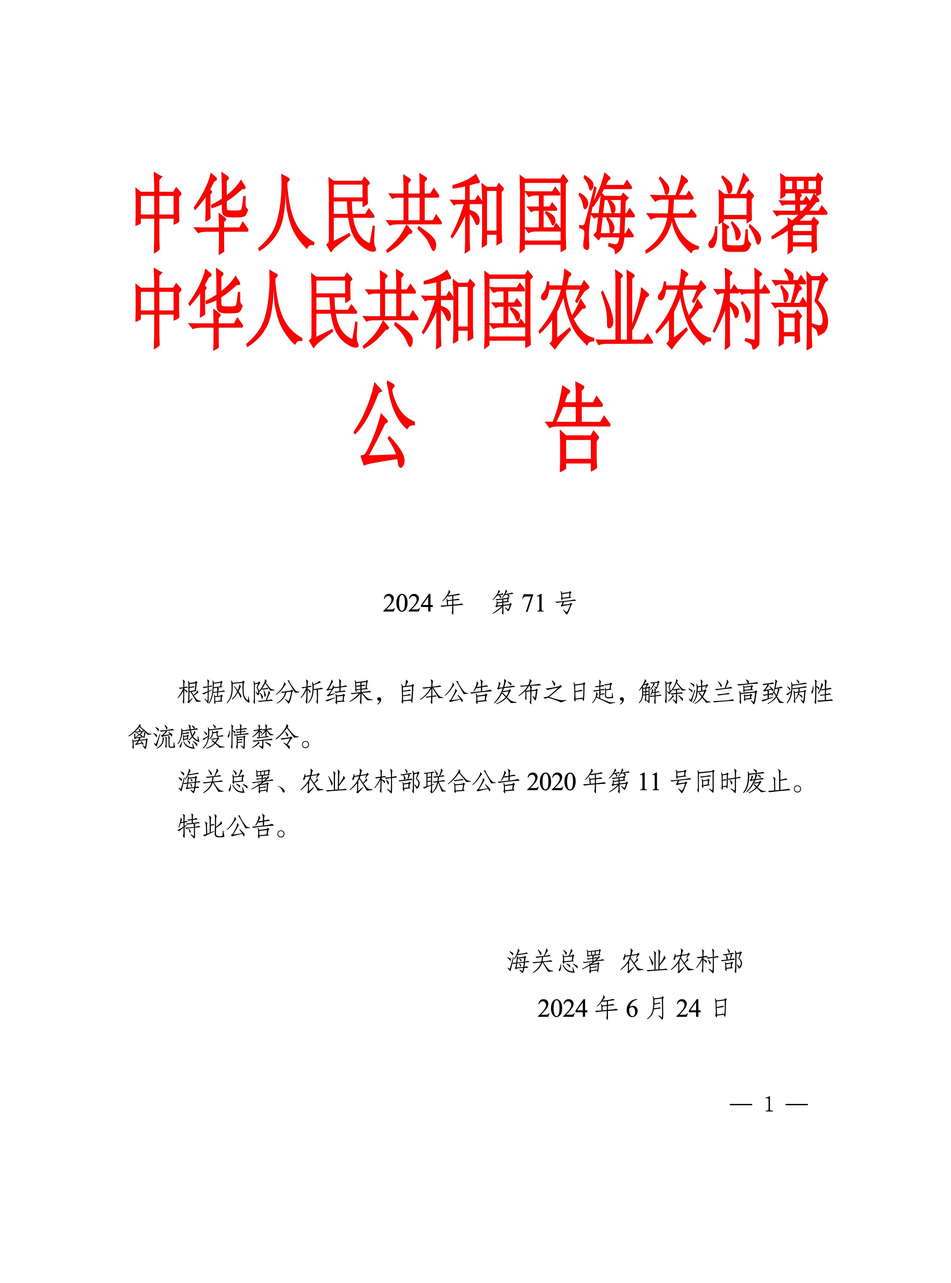 海关总署、农业农村部24日发布公告,根据风险分析结果,自公告发布之日起,解除波兰高致病性禽流感疫情禁令。海关总署、农业农村部联合公告2020年第11号同时废止。