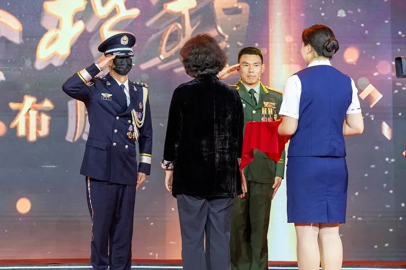 张从顺次子张子兵、张从顺生前战友丁良庆向英雄父子遗像敬礼。