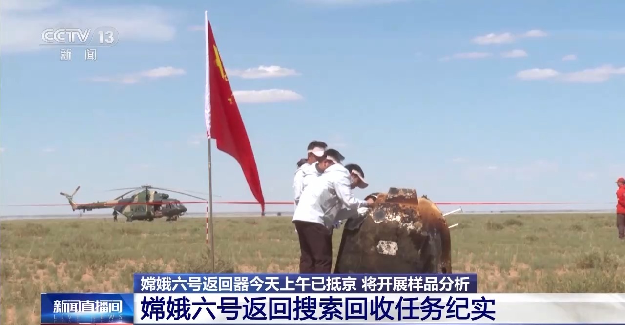 总台记者 武小斐:我现在已经来到了嫦娥六号返回器的周边,可以看到返回器目前呈一个直立的姿态,现场的工作人员也正在有序地开展各项作业,并且建立了20米乘以20米的这样一个警戒区。