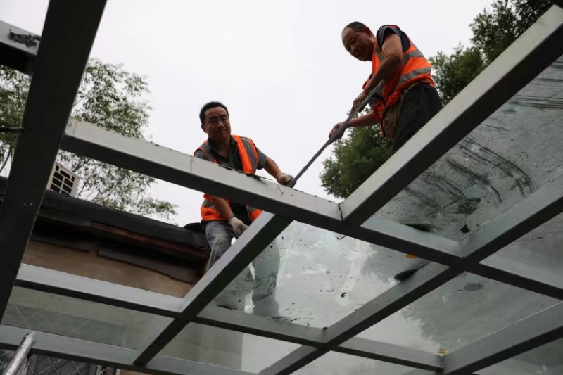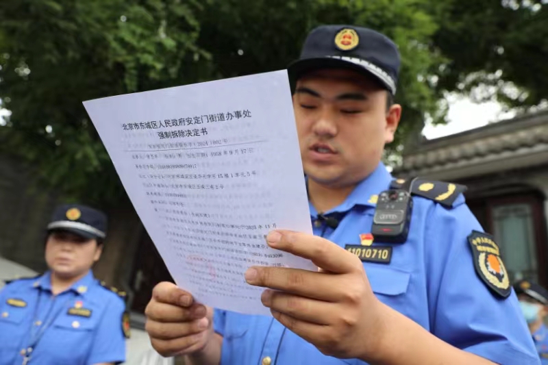 施工现场被查封后,由于当事人不配合后续执法工作,6月21日,安定门街道组织公安、城管、消防等多个部门,在社区工作人员的见证下宣读强制拆除决定书。当天召集工人,首先对院内涉案阳光棚先行强制拆除,待中考考试结束后对地下室按照工序进行回填。