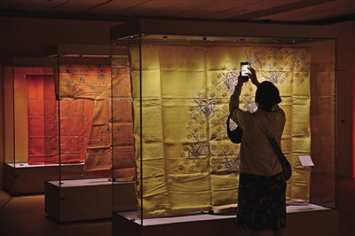 传说中的“羽服”——孔雀翎地金龙纹吉服袍料也首次在展览上亮相。这件龙袍衣料通铺孔雀羽线为地,又以捻金线和五色丝绒绣龙纹、云蝠纹、皮球团花纹及海水江崖纹。据悉,此类孔雀羽工艺的龙袍在清代宫廷内服饰中属于珍稀瑰宝。