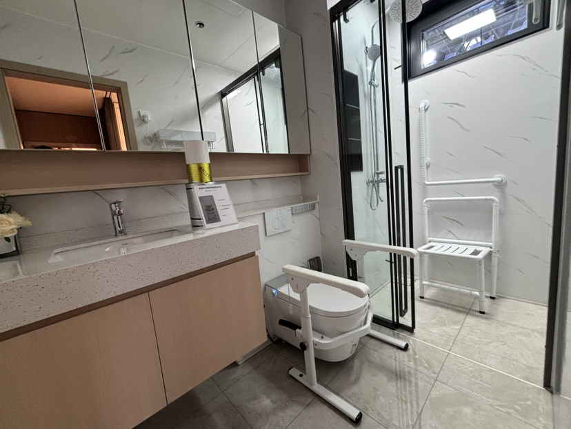在卫生间,地面是防滑砖、墙面有适老化扶手、淋浴区配有折叠座椅,这里甚至还配有AI传感器智能识别功能,人离开浴室就会自动关闭浴霸等设备。一旦老人在卫生间滑倒,只要按动警报按钮,就能一键呼叫家人或急救中心。