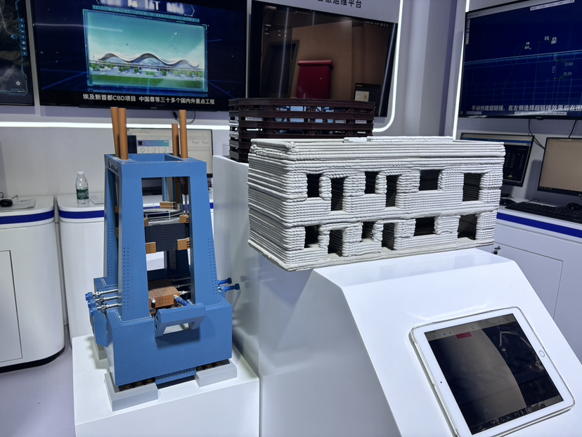 而在中国建筑技术中心展台上,摆放着一个等比例缩小的3D打印房屋模型。记者看到,一种高强度的建筑材料从管道中涌出,渐渐地,一栋房屋便建造完成。