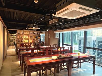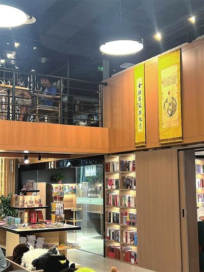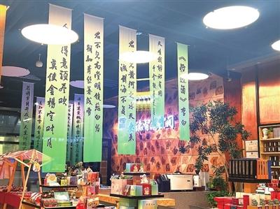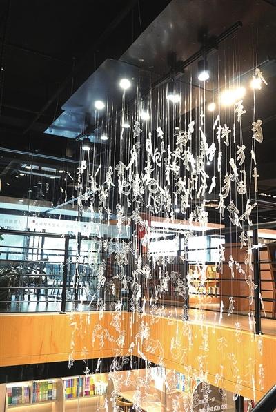 “自从前几周发现了这家书店,最近闲来无事的时候总会来这里看看书。”家住东升科技园附近的张先生说道,“我特别喜欢历史,最近正在看《史记》,这里也有各种各样历史类的书籍,极大地丰富了我退休之后的生活。”环顾四周,古今结合,古籍、古文化的元素渗透于书店的各个角落,但又不乏现代的艺术装饰。甲骨文构造了门厅的装饰背景,部首偏旁串联起来连接着一二楼的空间……此外,目前《将进酒》诗句的条幅悬挂于店内,“我们最近在将古诗背诵与书店文化相结合,只要读者可以完整背下《将进酒》全诗,就可以免费获得一杯饮品。”王乾旭说道。