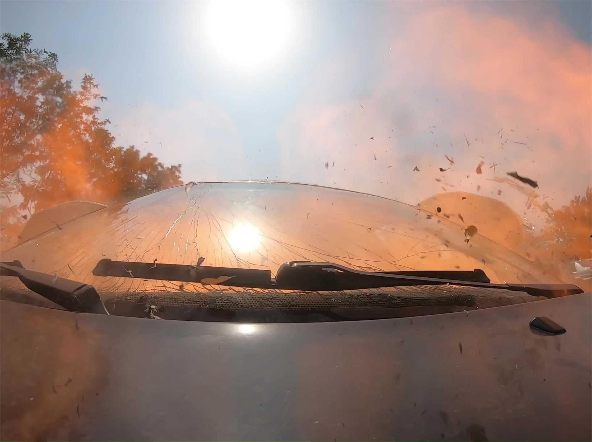消防员站在车外,使用点火棒靠近车窗缝,当火苗接触到车内的气体后,瞬间发生了爆燃现象,车辆两侧玻璃被炸飞到了10米外的空地上,就连后备箱的车盖也被气浪掀起。2分钟后,车内出现明火,一旁待守的消防员赶紧灭火。