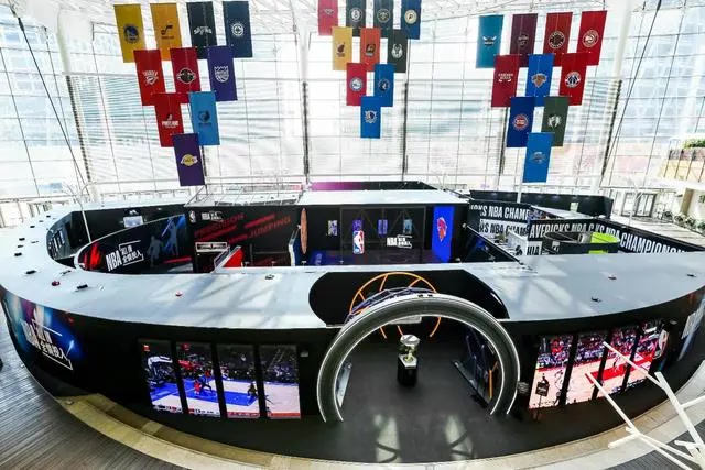 站在象征辉煌的光影通道上,你能看到刻有NBA历年夺冠球队的名称。从这里踏入NBA文化的序章,即刻展开一场沉浸式的时空之旅。