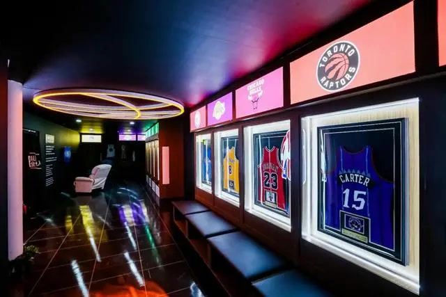 原汁原味还原的NBA球员更衣室,让你身临其境感受NBA的更衣室文化。这里承载着球队的核心,洋溢着活力与激情。球员们在这里井然有序地展示着自己的球衣和球鞋,每一件物品都承载着他们的荣耀与梦想。墙上挂满了比赛照片和奖杯,记录着他们一同度过的辉煌时刻。