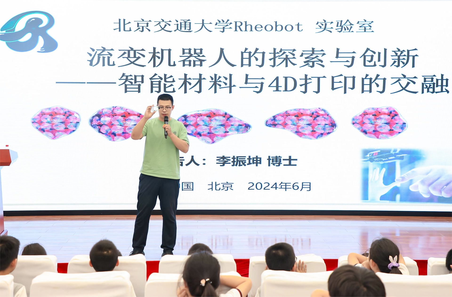 这场科普讲座的主题是“流变机器人的探索与创新——智能材料与4D打印的交融”,不仅给孩子们介绍了流变机器人的最新研究成果和应用前景,还给孩子们普及了智能材料、4D打印技术。