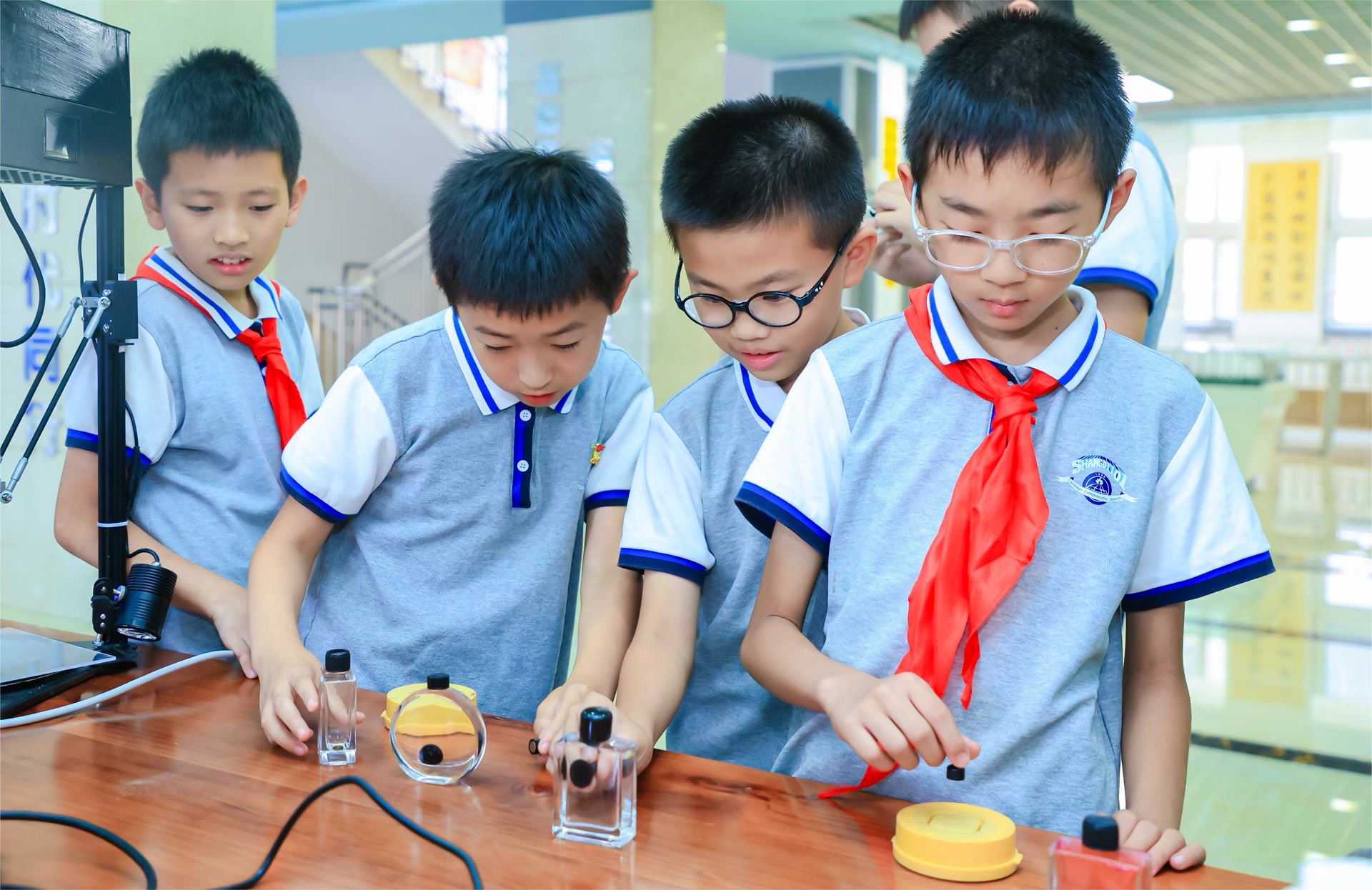 科普讲座之后的互动体验,更是让孩子们沉浸在科技的世界里。他们有的在地面智能钢琴上“弹奏”乐曲,有的戴上VR眼镜感受另一个平行的世界,有的拿起磁体指挥流变机器人运动……