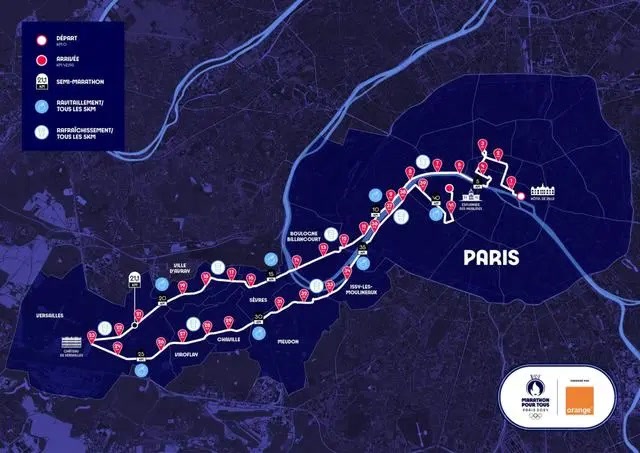 根据巴黎奥组委的计划,当地时间8月10日晚上9点,也就是奥运会男子马拉松比赛结束的当晚,来自全世界的40048名马拉松跑者将在奥运赛道上参加全程马拉松和10公里跑比赛。与奥运会马拉松线路一样,参与大众全程马拉松的跑者从塞纳河边的巴黎市政厅出发,途经巴黎歌剧院、杜乐丽花园、卢浮宫、协和广场等景点,一直跑到20公里外的凡尔赛宫。返程线路会经过埃菲尔铁塔,终点设在荣军院,赛道全程爬坡总高度438米。马拉松赛道的设计灵感源自法国大革命期间爆发的“十月事件”,巴黎奥组委希望通过这样的赛道路线来致敬历史,向所有为“自由、平等、博爱”精神付出的人致敬。