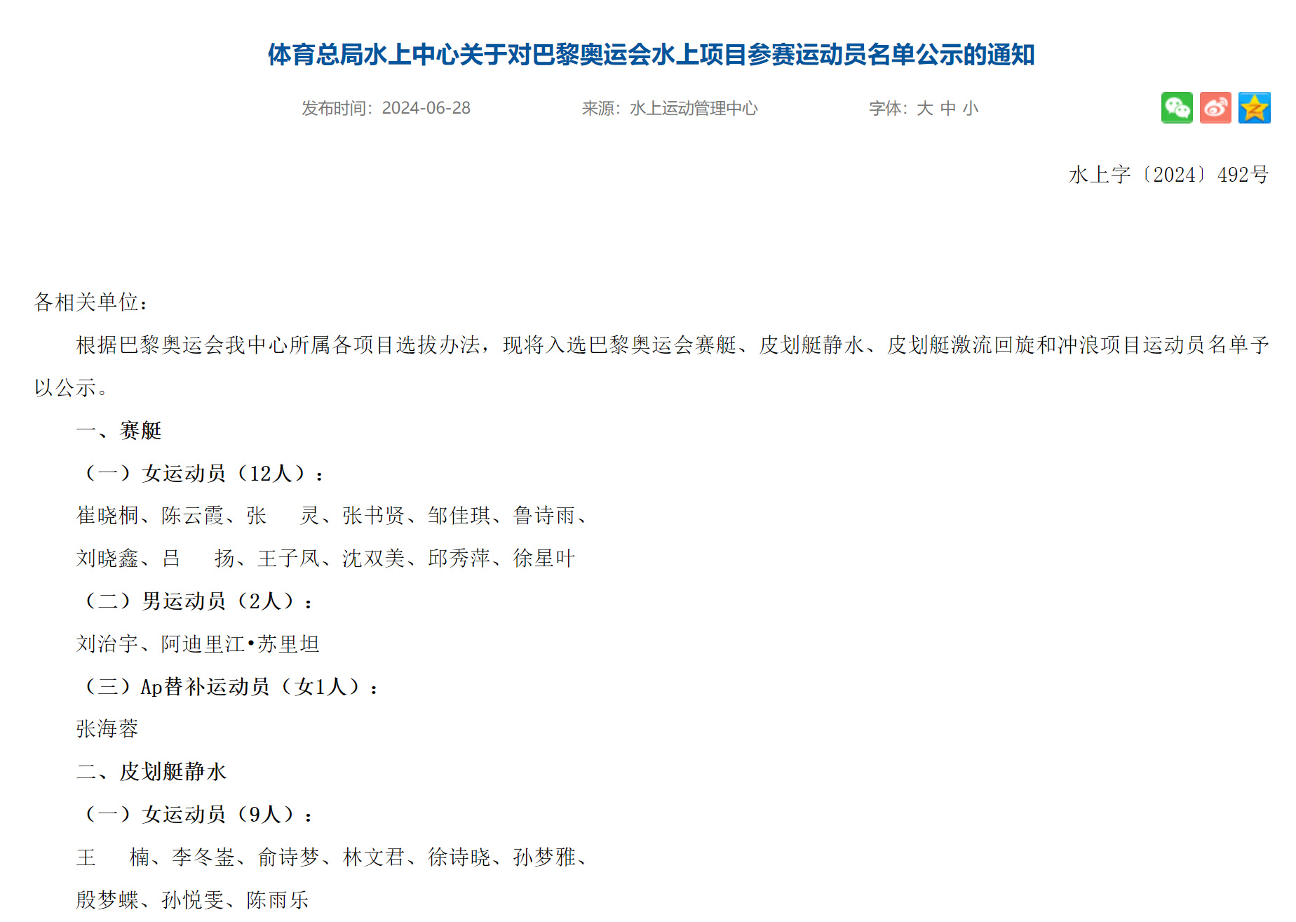 6月28日,国家体育总局水上运动管理中心在其官网公示了巴黎奥运会水上运动项目中国队运动员名单,具体如下。