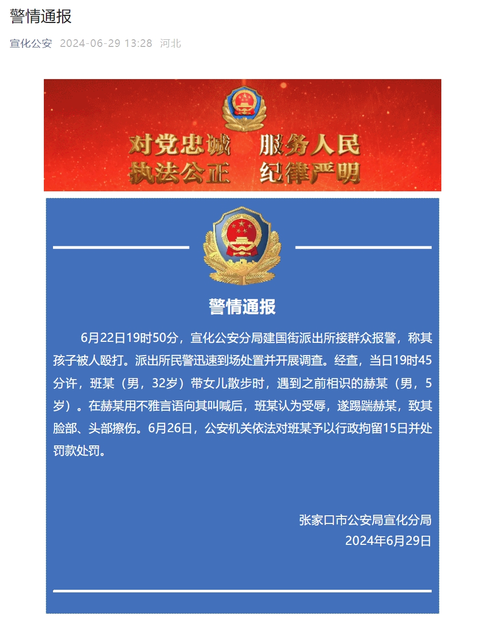 张家口市公安局宣化分局6月29日通报:6月22日19时50分,宣化公安分局建国街派出所接群众报警,称其孩子被人殴打。派出所民警迅速到场处置并开展调查。经查,当日19时45分许,班某(男,32岁)带女儿散步时,遇到之前相识的赫某(男,5岁)。在赫某用不雅言语向其叫喊后,班某认为受辱,遂踢踹赫某,致其脸部、头部擦伤。6月26日,公安机关依法对班某予以行政拘留15日并处罚款处罚。