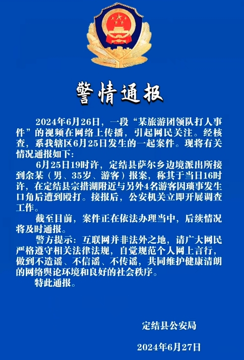 2024年6月26日,一段“某旅游团领队打人事件”的视频在网络上传播,引起网民关注。经核查,系西藏自治区日喀则市定结县辖区6月25日发生的一起案件。