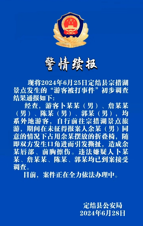 6月25日19时许,定结县萨尔乡边境派出所接到余某(男、35岁、游客)报案,称其于当日16时许,在定结县宗措湖附近与另外4名游客因琐事发生口角后遭到殴打。接报后,公安机关立即开展调查工作。