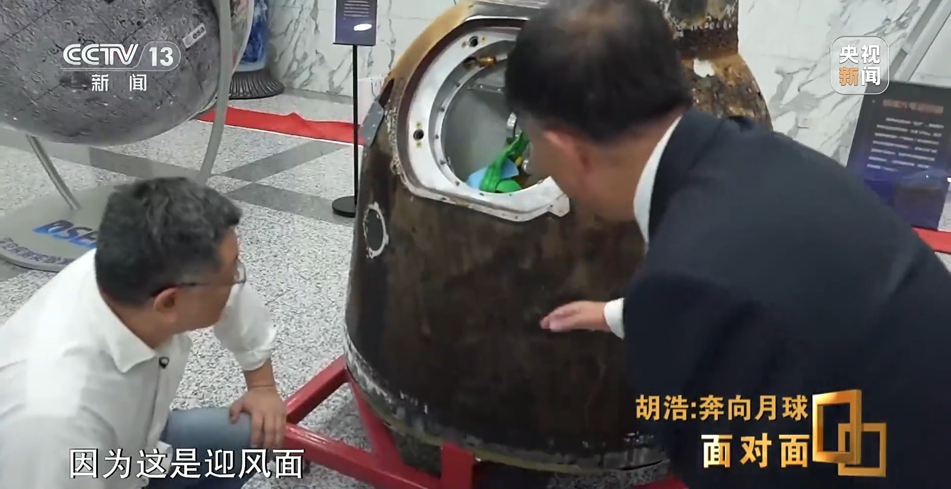 嫦娥六号任务总设计师胡浩:这些都是烧蚀的,因为是迎风面,我们这次因为路程短了,嫦娥五号跑了6500公里,这个只有5600公里,路程短了,烧蚀量速度还是这么快,所以烧蚀得比嫦娥五号厉害。