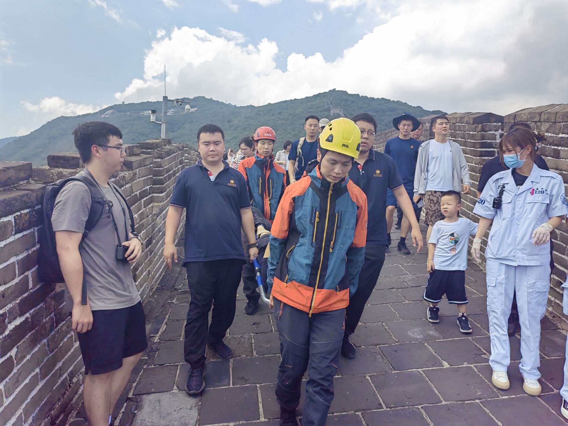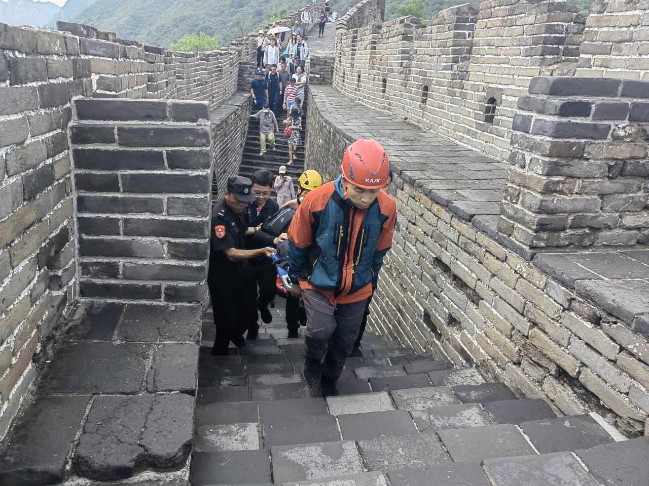 13时23分,消防救援人员到达慕田峪景区,与景区工作人员会合后,大家一同赶往山上开展救援。当时正逢一天最热时段,消防救援人员背负着绳索和担架等救援器材,36℃的高温给现场救援增加了不小难度。