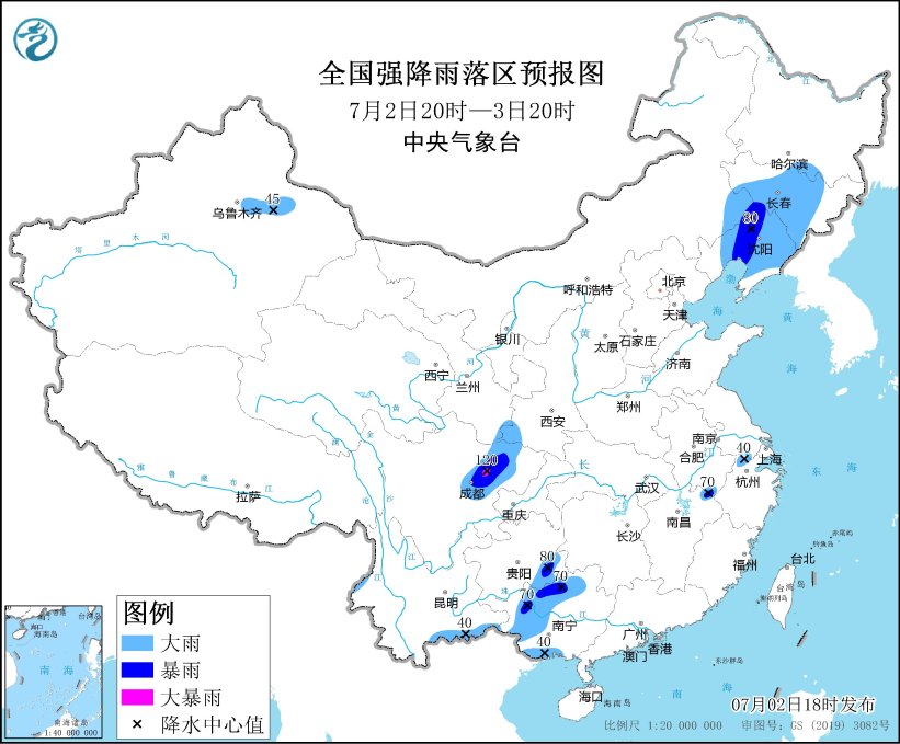 预计,7月2日20时至3日20时,内蒙古东南部、吉林、辽宁、陕西西南部、四川盆地西部、贵州东南部、广西中西部和南部、云南西北部和东南部、安徽南部、浙江北部、江西东北部以及新疆沿天山地区等地的部分地区有大到暴雨,其中,四川盆地西北部局地有大暴雨(100~120毫米)。上述部分地区伴有短时强降水(最大小时降雨量20~50毫米,局地可超过60毫米),局地有雷暴大风等强对流天气。