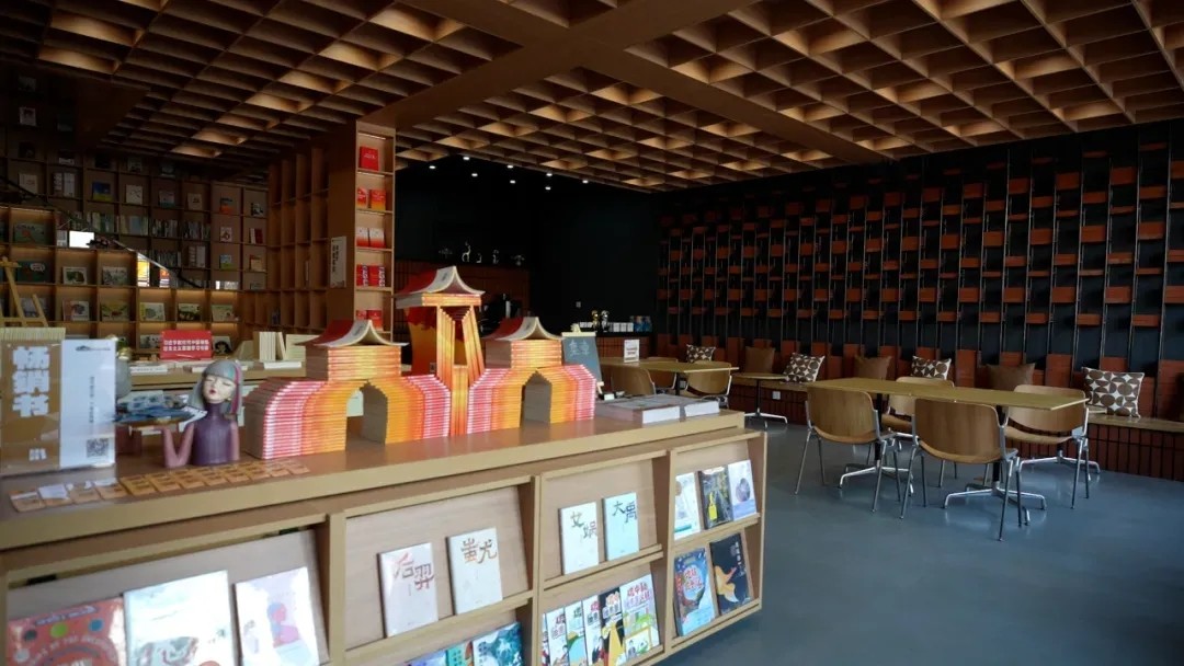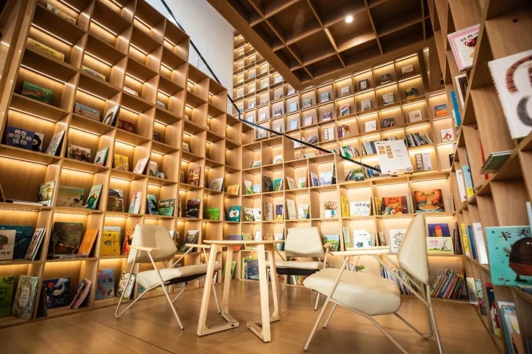 走进介山书店,首先映入眼帘的是宽敞明亮的阅读空间,书店内部设计简约而不简单,木质书架和柔软的座椅营造出一种温馨舒适的氛围。屋顶沿用了书架的设计,实现了一种延伸感。