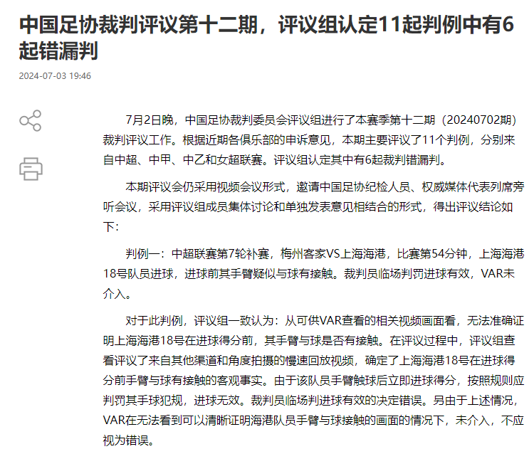 3日晚,中国足协发布第十二期裁判评议,其中有三起判罚涉及两场中超比赛,分别为上海海港对梅州客家和上海海港对武汉三镇。而足协认定,在海港2比1战胜梅州的比赛中,奇塔迪尼、武磊打入的两个进球均应判定进球无效,裁判员临场判进球有效的决定错误。此外在海港与三镇队的比赛中,主裁漏判海港球员王振澳一张黄牌。