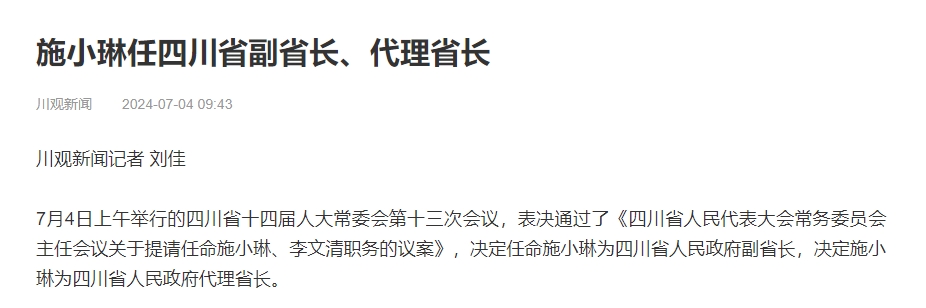 7月4日上午举行的四川省十四届人大常委会第十三次会议,表决通过了《四川省人民代表大会常务委员会主任会议关于提请任命施小琳、李文清职务的议案》,决定任命施小琳为四川省人民政府副省长,决定施小琳为四川省人民政府代理省长。