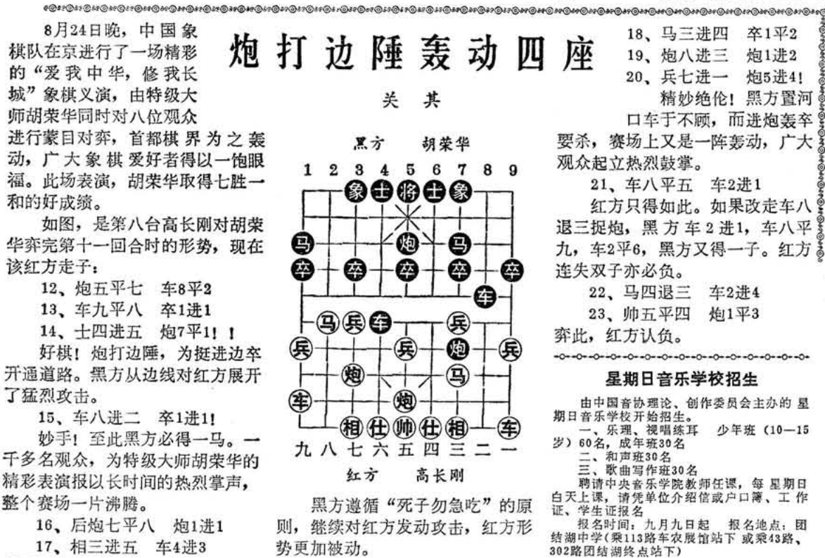 8月24日傍晚,北海体育场,胡荣华一人对战8名棋手,每一步报棋人都会用话筒报出来,让现场观众能够随时知道全场棋局的情况。
