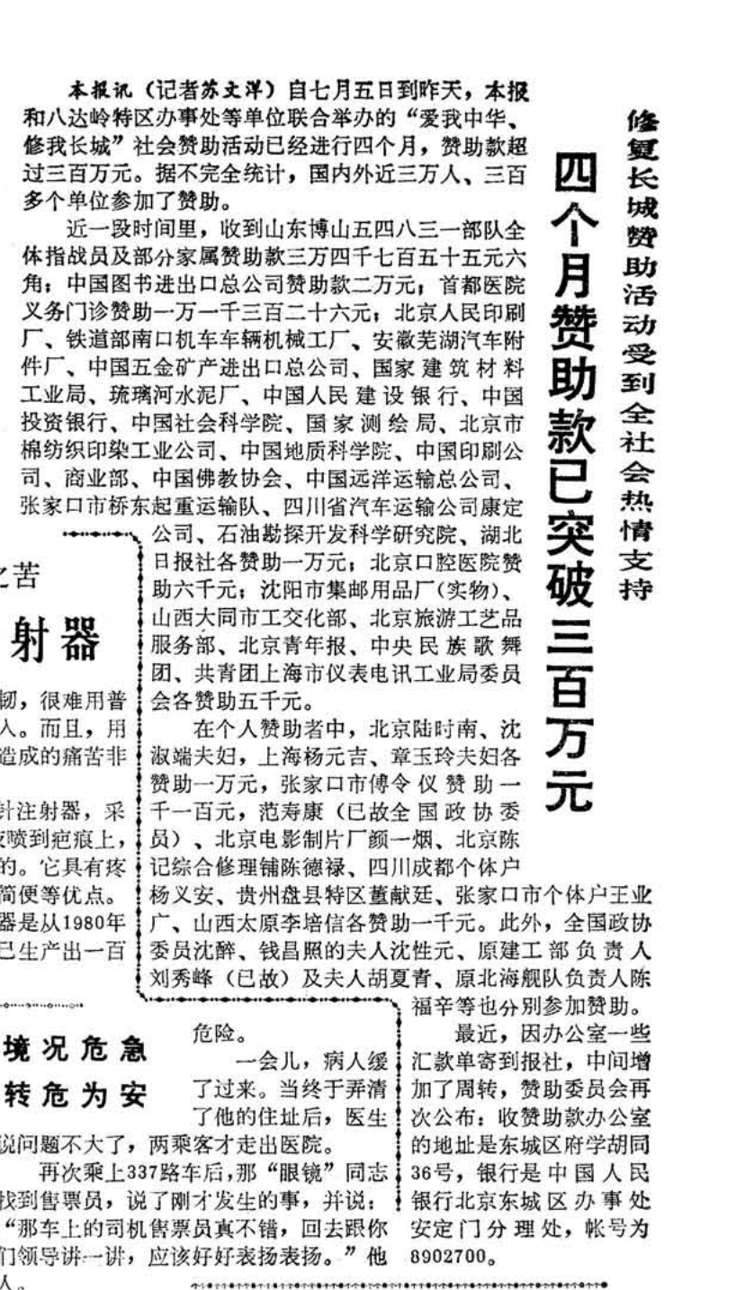 1984年11月5日的《北京晚报》头版上,登载着这样一则消息:在国内外近三万人、三百多个单位的热情支持下,修复长城活动开展四个月来收到的赞助款已突破三百万元;而在近期收到的个人赞助款中,有1000元来自一位名叫李培信的山西太原人士。