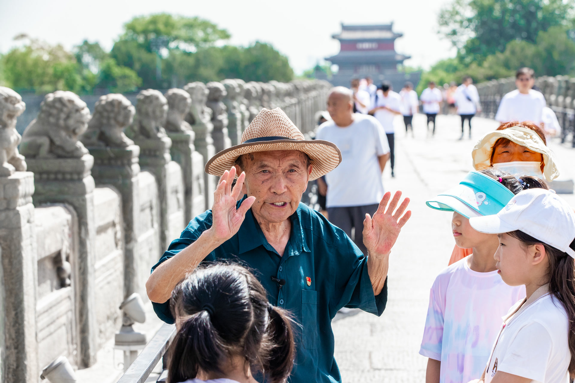 在卢沟桥这段近一公里的石板路上,曾有逃难者的脚步,有侵略者的铁蹄,也有保家卫国的中国人民奋起反抗的身影!此后的70余年,郑福来成为了一名抗战史的“义务讲解员”,他不惧风吹日晒,用自己的亲身经历在卢沟桥上为来自世界各地的游客讲解抗战往事,从不收取任何费用。近年来,尽管年事已高,但他仍坚持参与义务讲解。老人坚持扶着栏杆站立讲解,讲到动情处,他说:“那段苦难的历史一直印在我的脑子里,我活一天就要讲一天,让更多人知晓那段历史。”