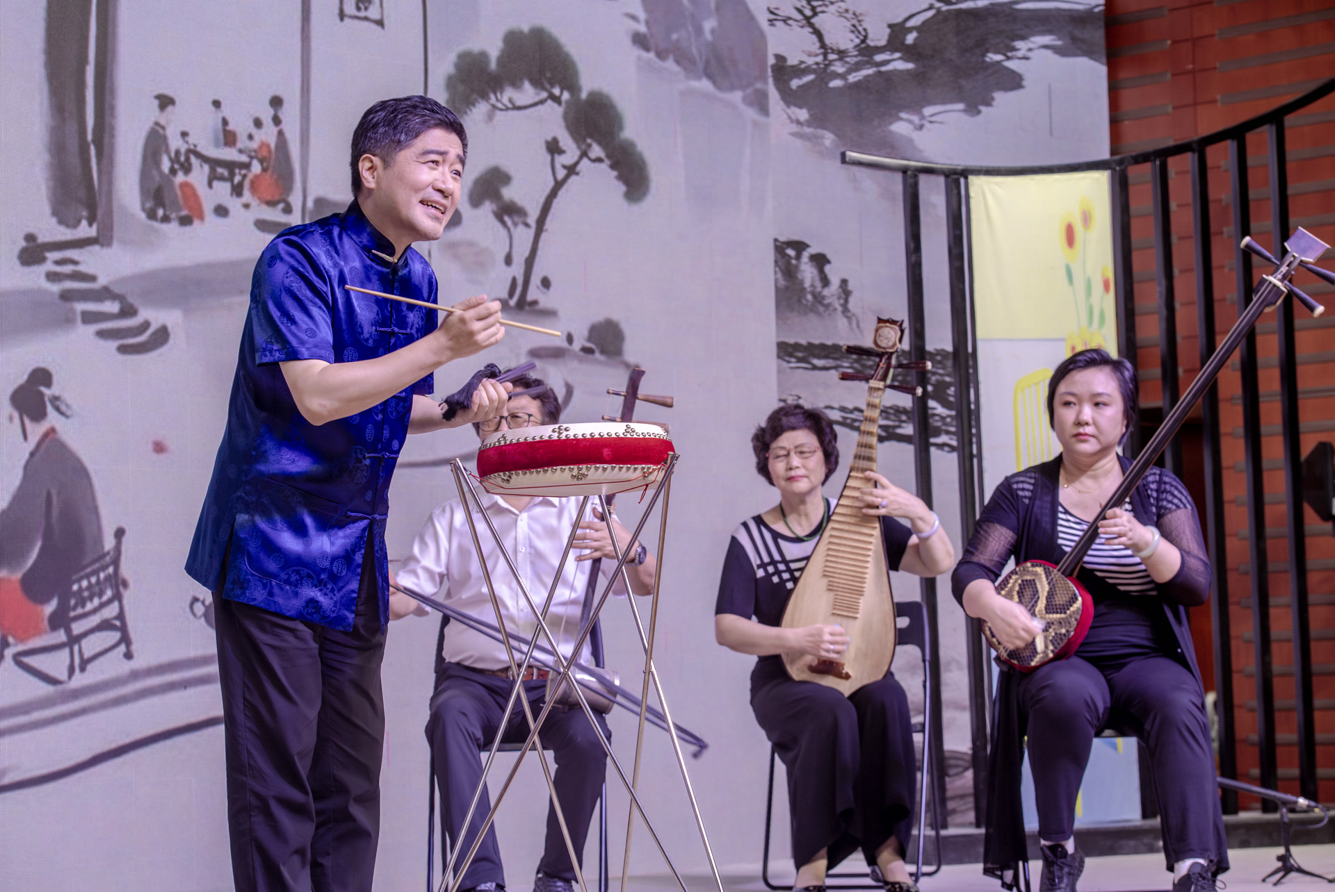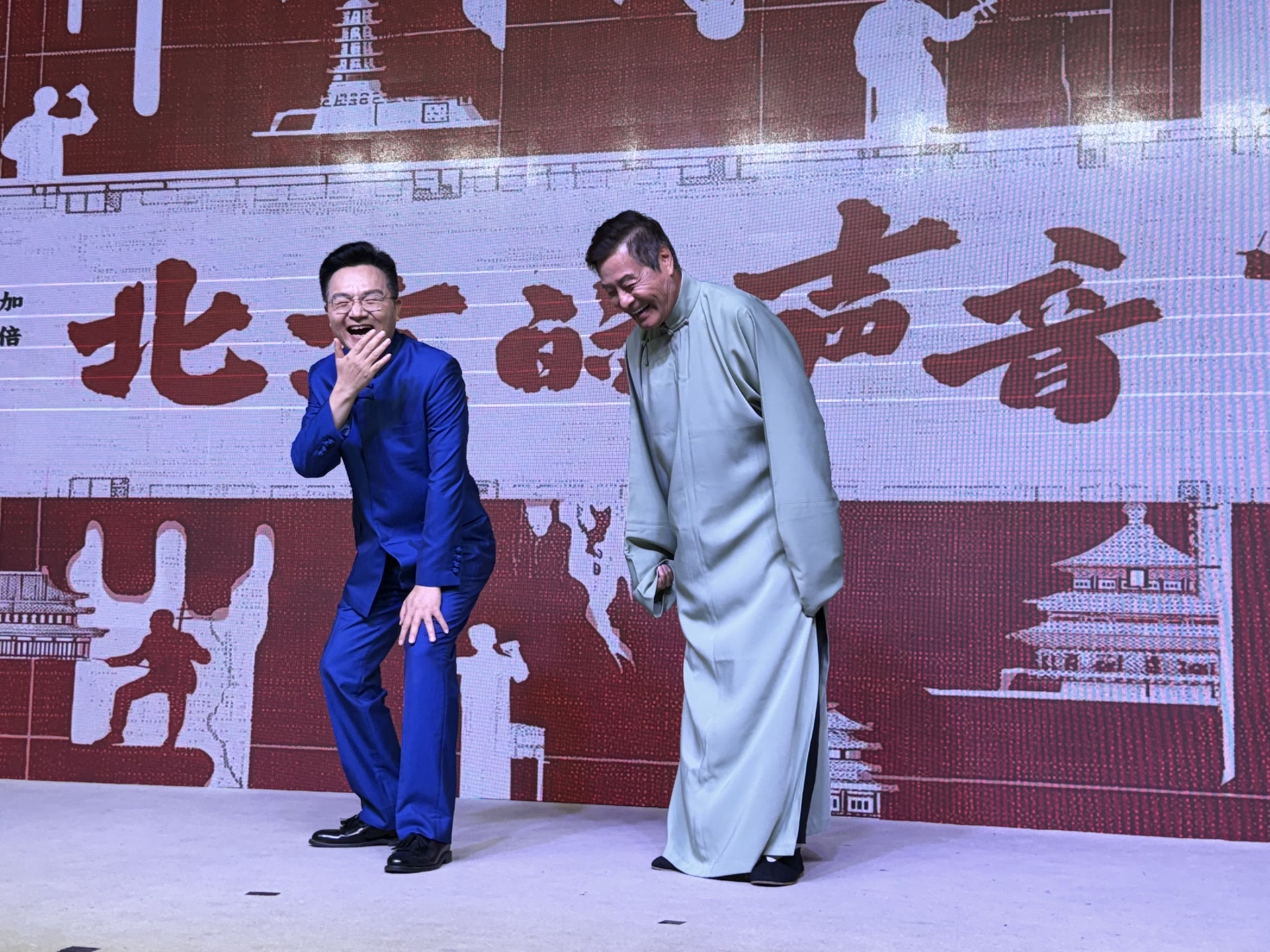 接下来的节目,既有由苏帅文创作、王文磊表演的京东大鼓《晨钟暮鼓》;也有由洪宗义表演的被称为“北京的旋律”的北京琴书《北京城》;还有由李娜、樊博表演,将梅花大鼓与昆曲表演相融合的梅花大鼓《桃花扇》,都给人耳目一新的艺术享受。为了纪念老舍先生诞辰125周年,应宁表演的滑稽大鼓《茶馆》通过说唱结合的形式完成情节拼接、人物穿梭、地点变幻、隔空对话,以焕新形式展开语言的戏剧画卷,并且充分体现了老舍先生的风趣幽默,让现场笑声掌声不断。